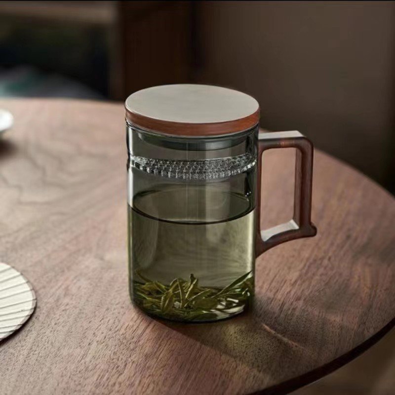 メーカーは高ホウケイ酸ガラス緑茶カップ月歯濾過カップ胡桃木取っ手グラスを生産している