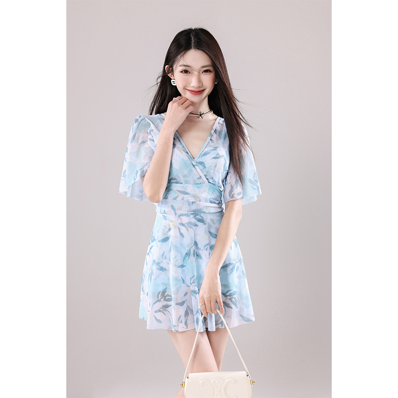 新款女士连体裙式蝴蝶印花小清新少女吊带温泉沙滩度假泳衣女批发