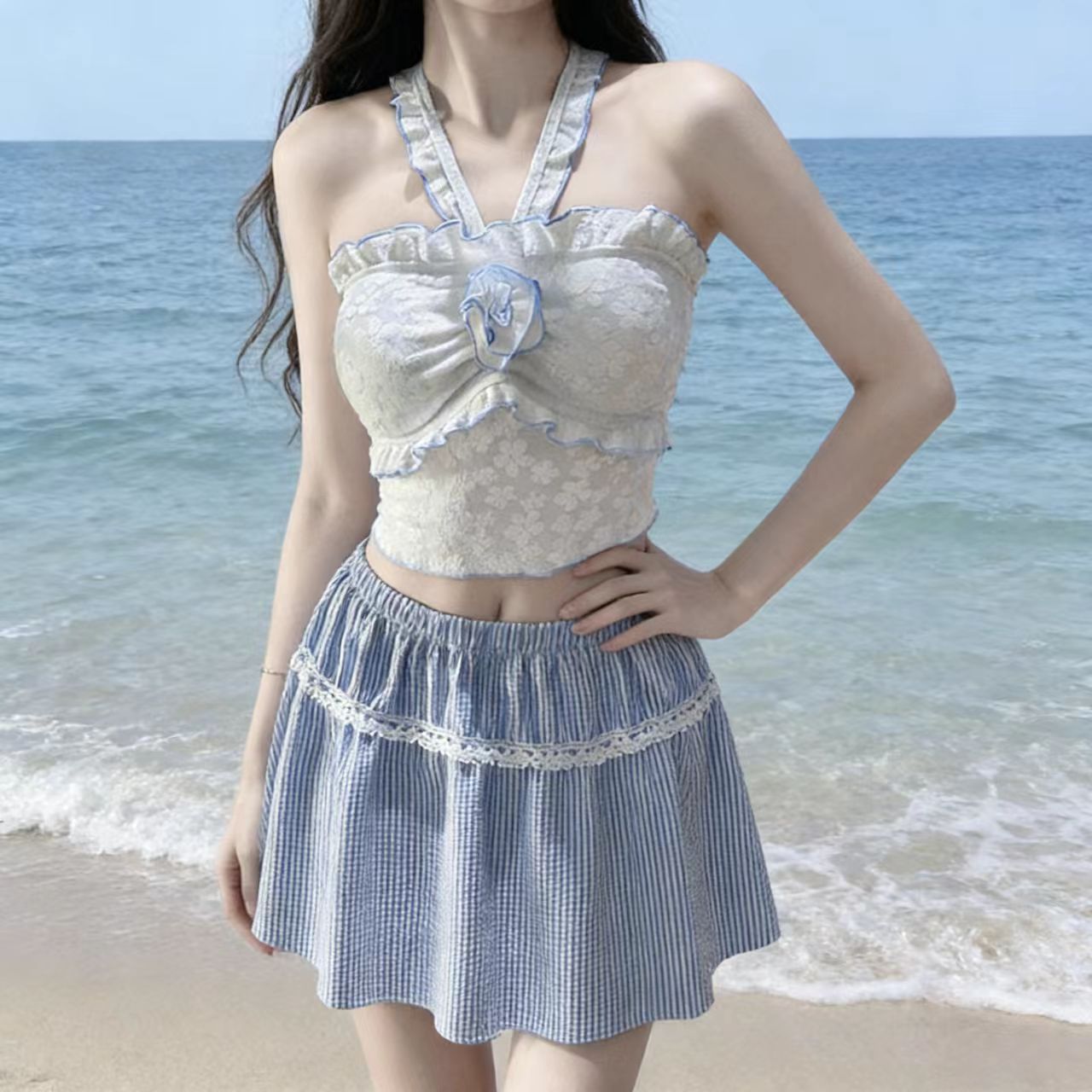 新款女士分体三件套多巴胺甜美挂脖条纹沙滩温泉度假泳衣女批发