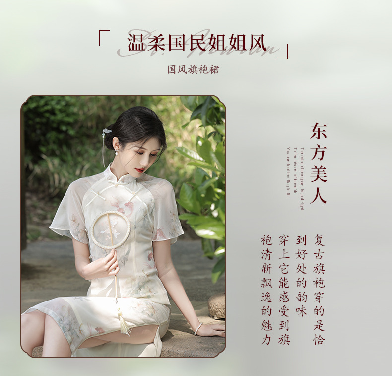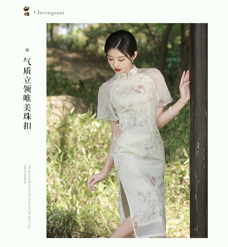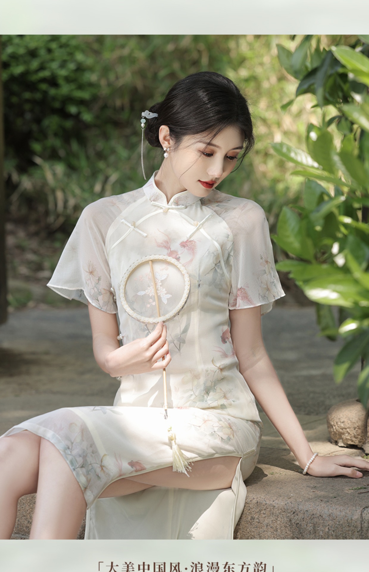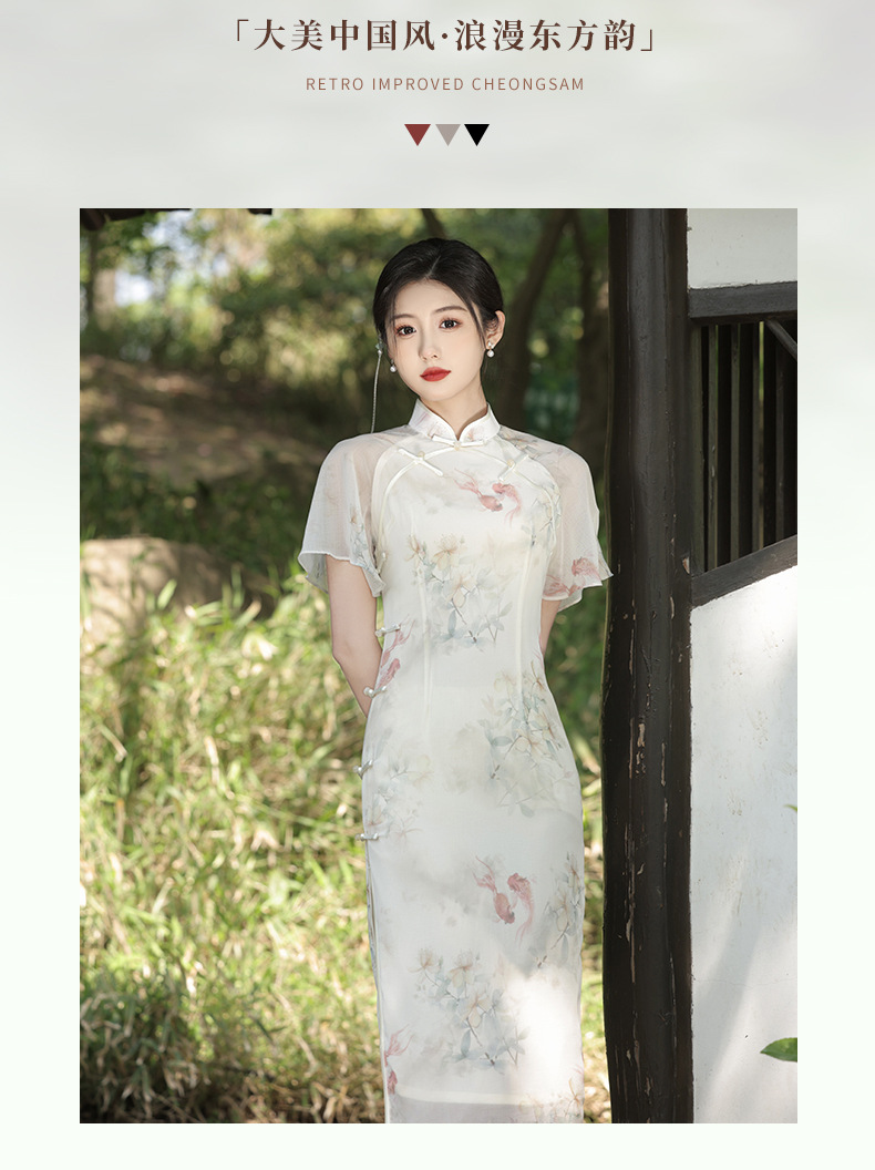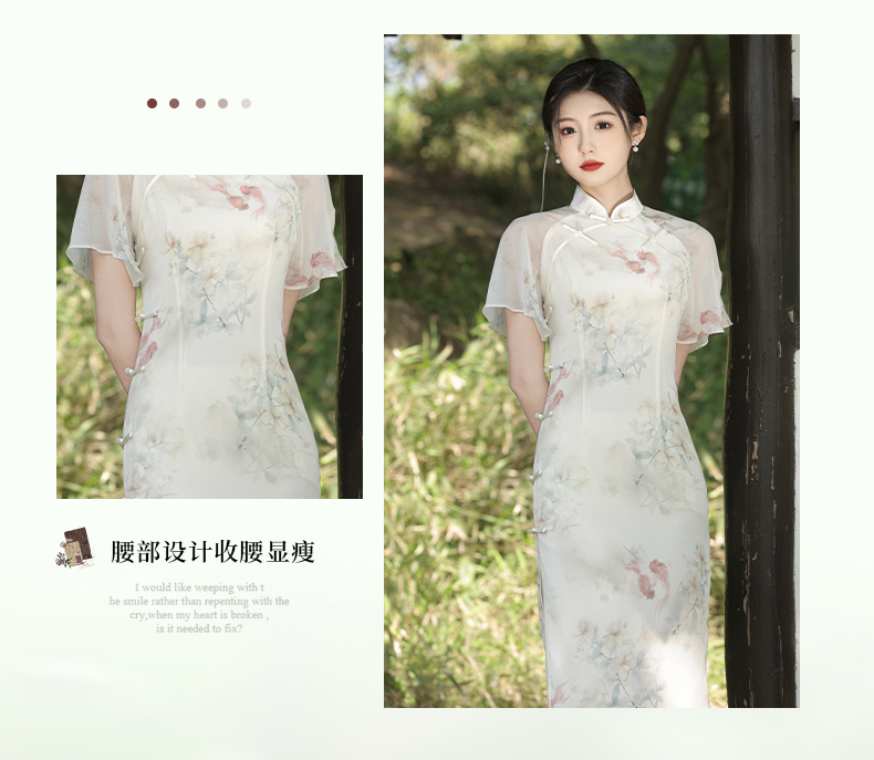 新しい中国のチャイナドレスの女性の夏のシフォンのワンピースは優雅に若いタイプの少女の気質を改良して、普段は丸い襟を着ることができます。