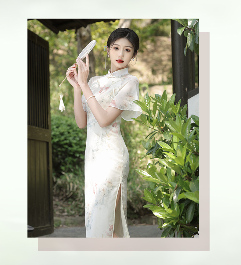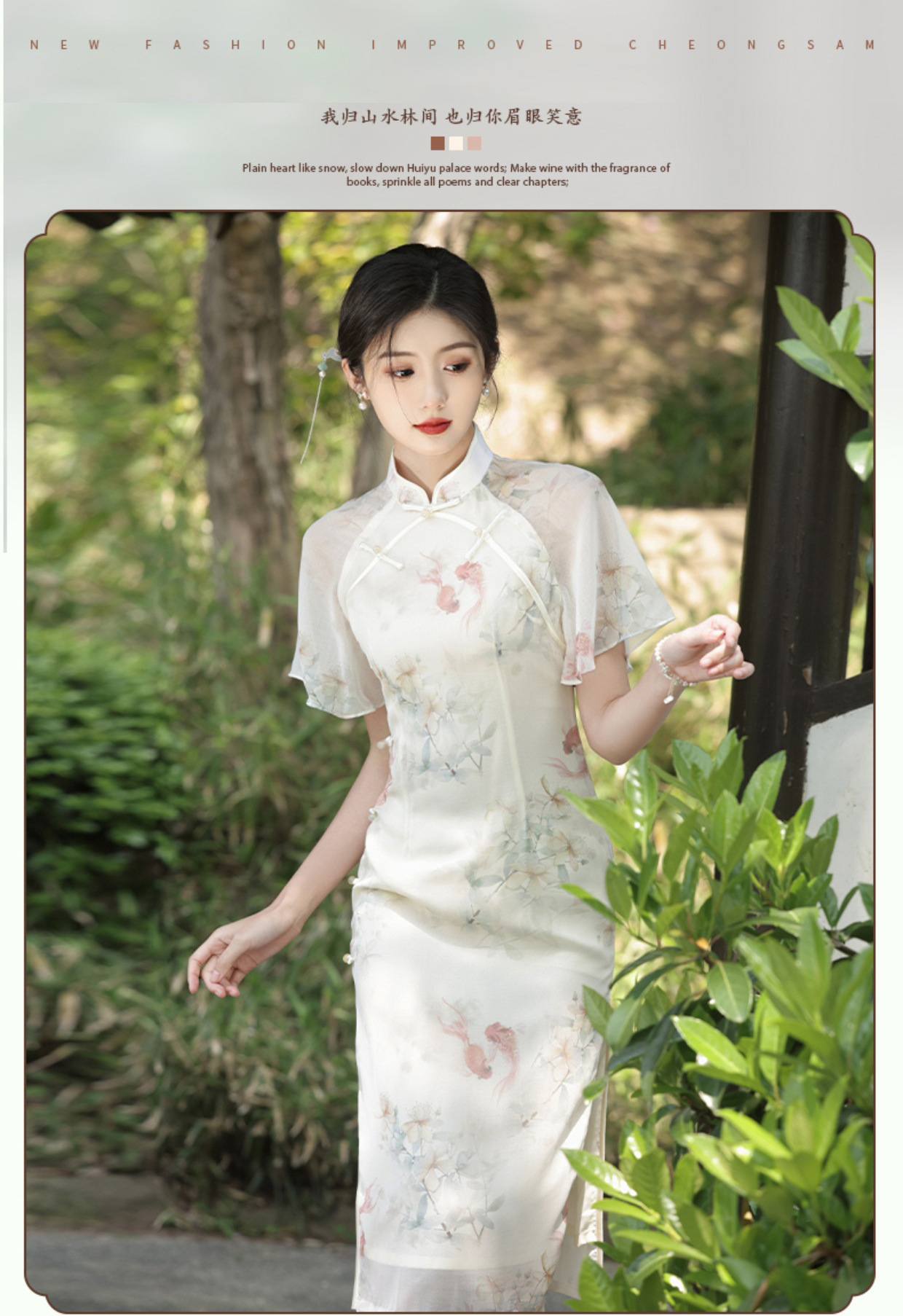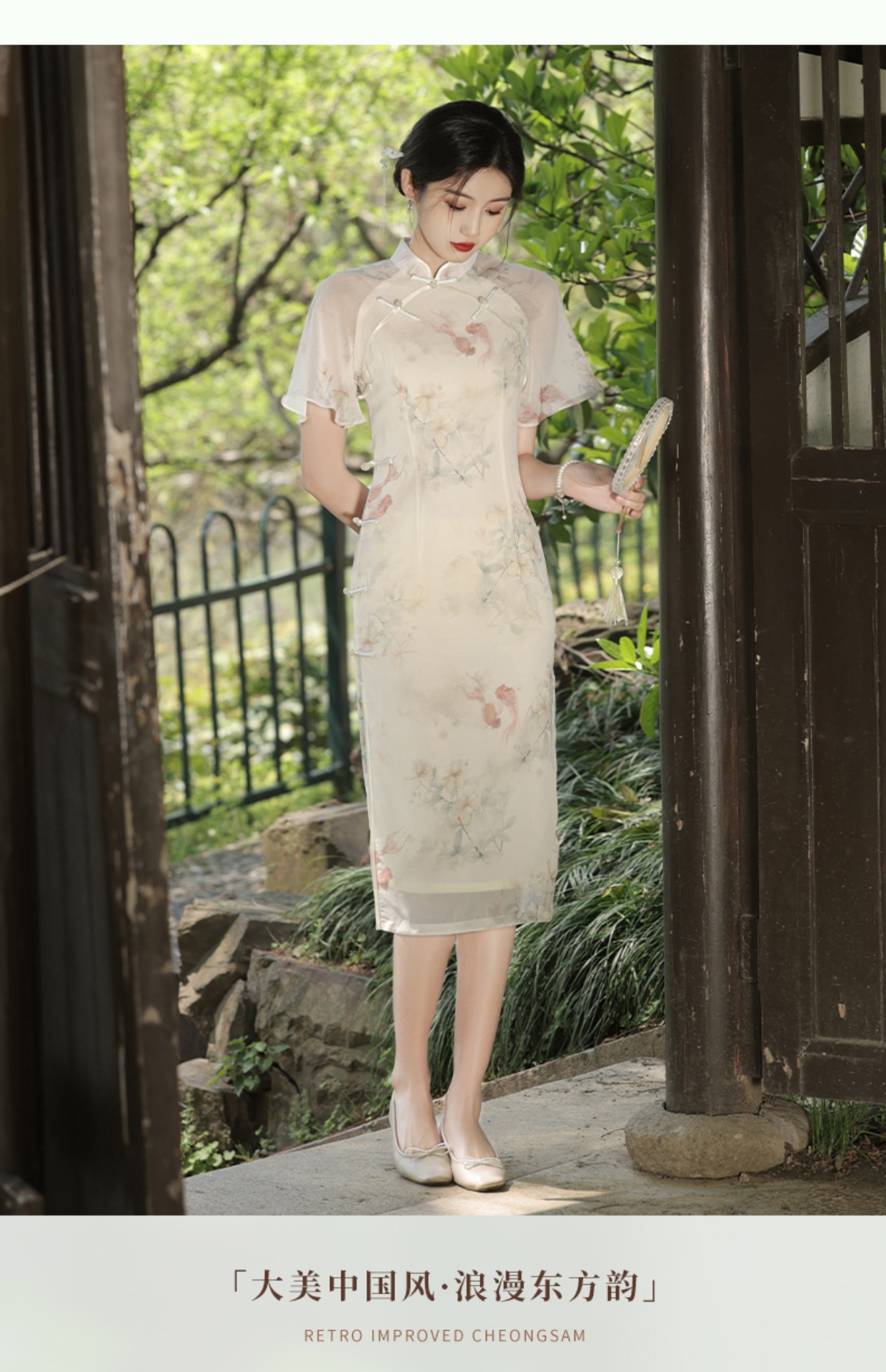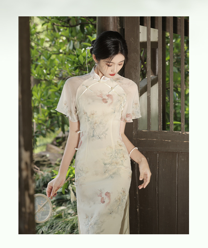 新しい中国のチャイナドレスの女性の夏のシフォンのワンピースは優雅に若いタイプの少女の気質を改良して、普段は丸い襟を着ることができます。
