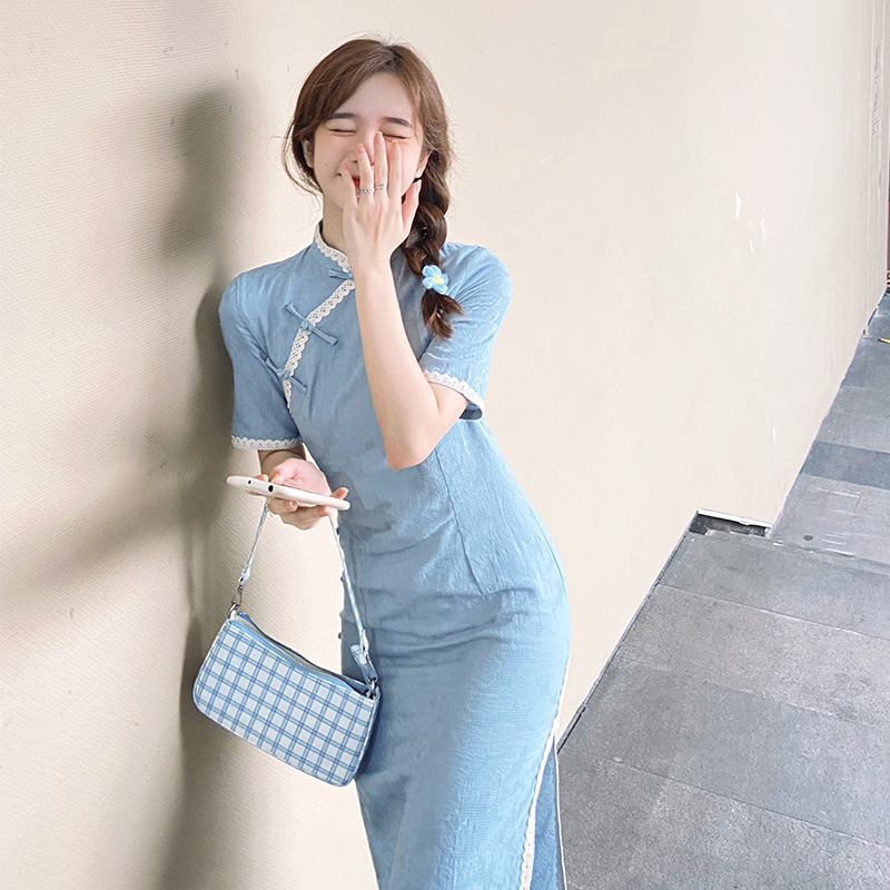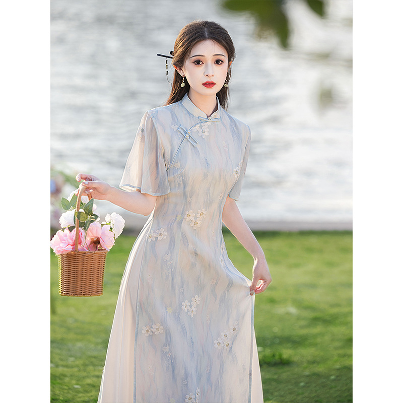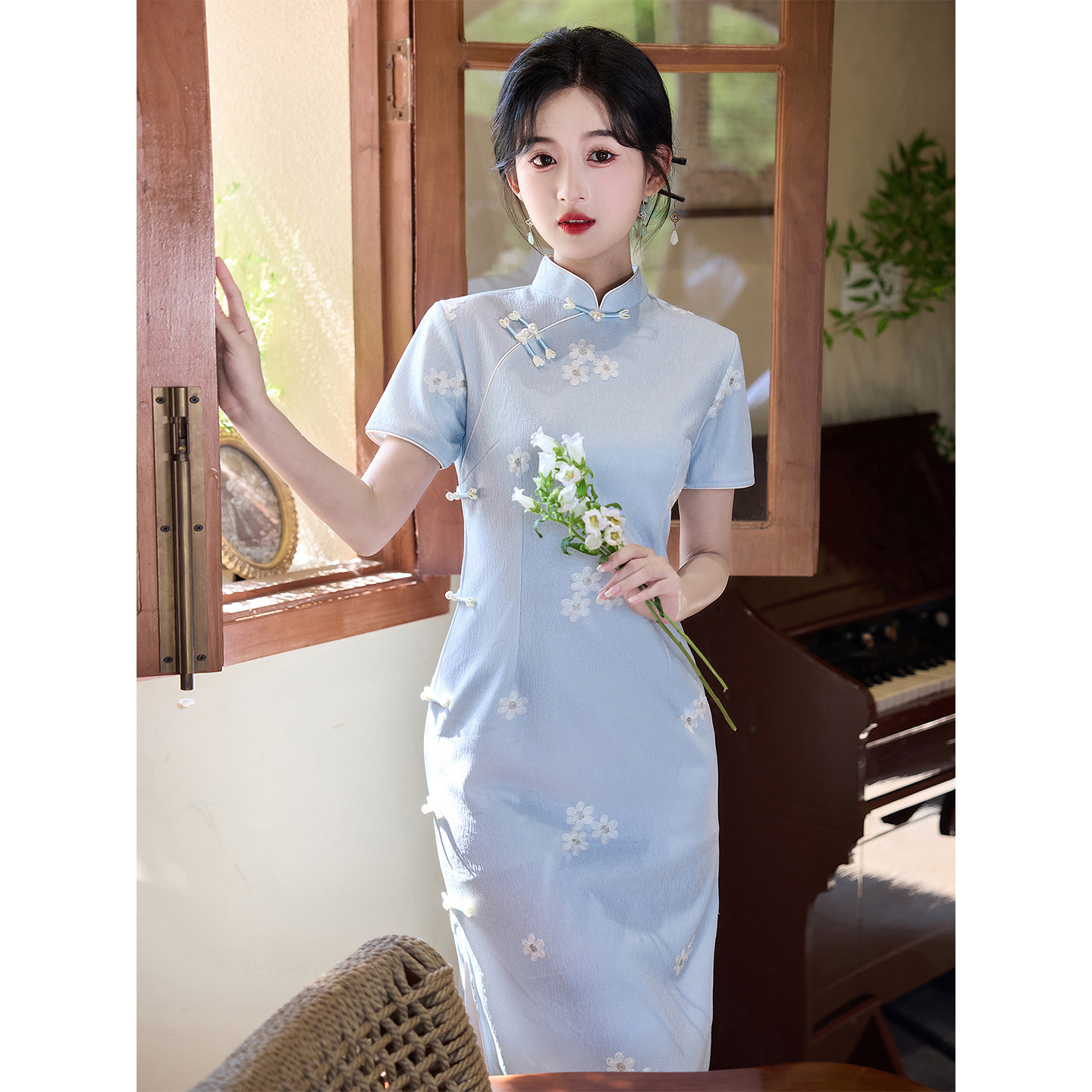 新鮮でエレガントなオードチャイナドレス2025新しい夏のライトブルー改良された若い女性の新しい中国ドレス
