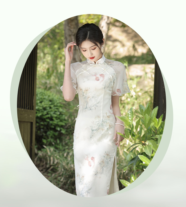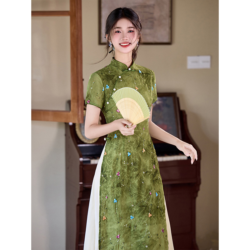 グリーンホワイトオーダー袍ドレス2025夏新レトロデイリー新中国風パフォーマンスウェア痩身ドレス