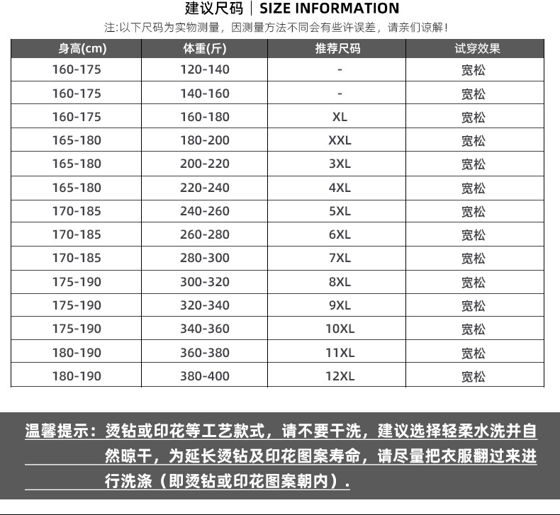 Mアドバイス (120-140)斤,L推奨 (140-160)斤,Xlアドバイス (160-180)斤,2xlアドバイス (180-200)斤,3xlアドバイス (200-220)斤,4xlアドバイス (220-240)斤,5xlアドバイス (240-260)斤,6xlアドバイス (260-280)斤,7xlアドバイス (280-300)斤,8xlアドバイス (300-320)斤,9xlアドバイス (320-340)斤,10xlアドバイス (340-360)斤,11xlアドバイス (360-380)斤,12xlアドバイス (380-400)斤