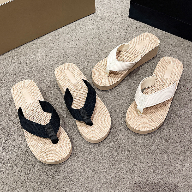草編み観光麻底坂とスリッパ女性韓国版のファッションは人の字を着てファッション的な滑り止めのビーチ靴を履いています。