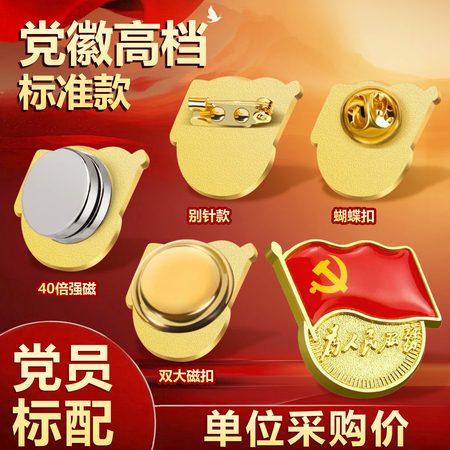 標準型党章、党員記章、団章、ピンタイプ磁気バックル、蝶バックル、強力磁気、高級厚手の新バージョン