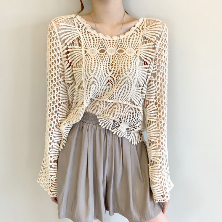 新商品の高級フランス上着の短いレースのユニークなブラウスの透かし彫りの露骨なtシャツのデザイン感のブラウスの女性の夏