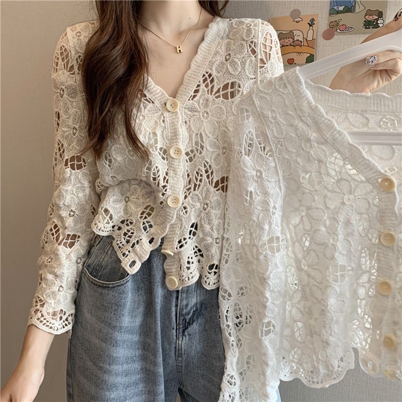 新作半袖韓国風透かし編みカーディガンニットセーター、おしゃれで万能、ピュアでセクシーなスタイル、着痩せ効果のあるカジュアルトップス