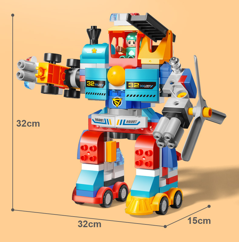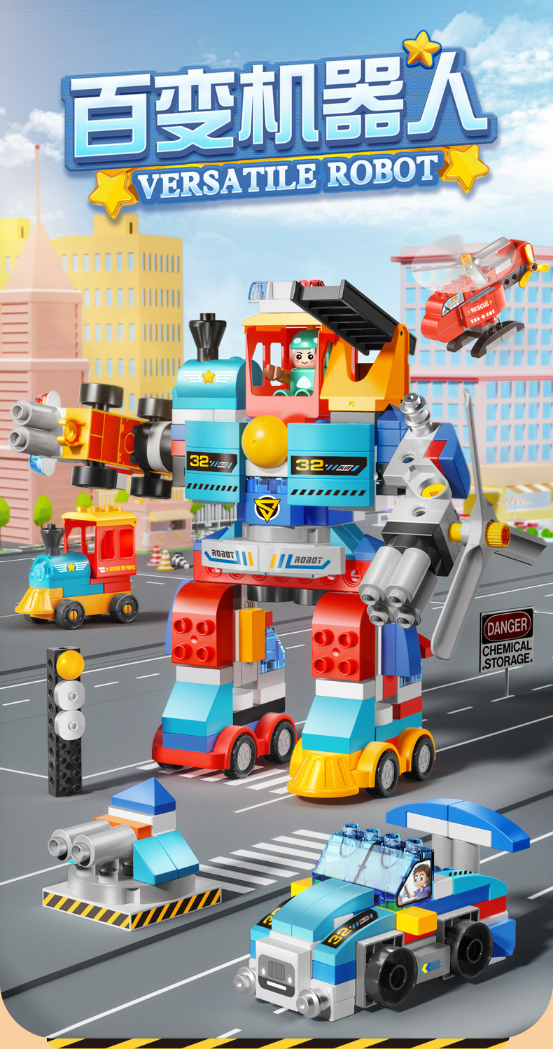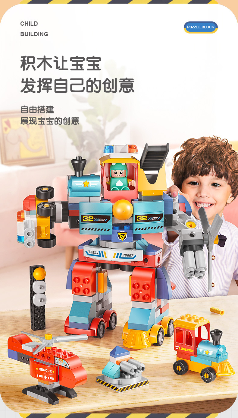 子供用の大きな粒子を組み合わせて益智積み木の男の子の変形合体ロボット飛行機の自動車のおもちゃを作ります。