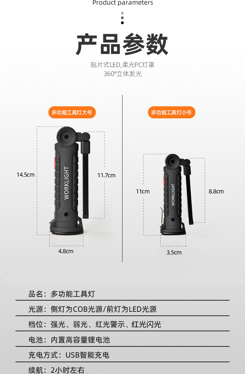 新品多機能充電コブ作業灯led点検灯折りたたみマグネット懐中電灯屋外緊急照明灯