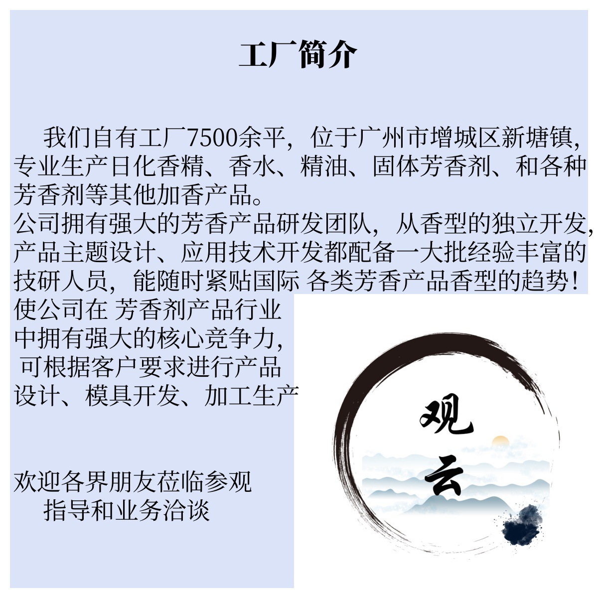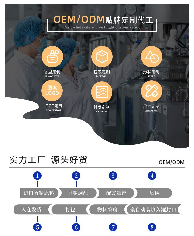 本公司是设计生产型工厂,有自己的设计师团队,可代加工,贴牌各种液体香薰,固体香膏,颗粒香薰,有给知名品牌、国内知名电商、世界500强商标企业代加工经验。公司历经11年时间,熟悉空间香水香膏行业各种配方,欢迎咨询下单!