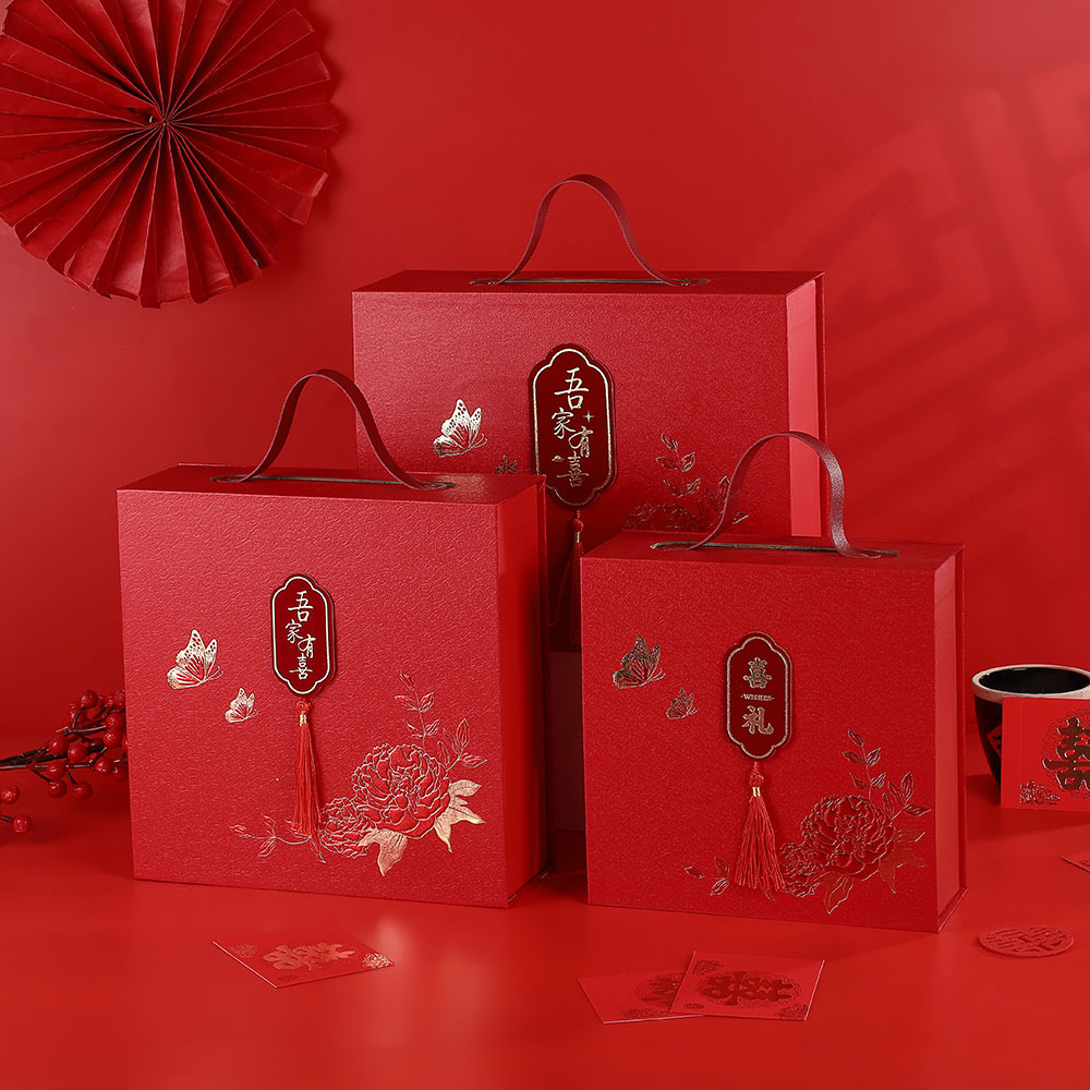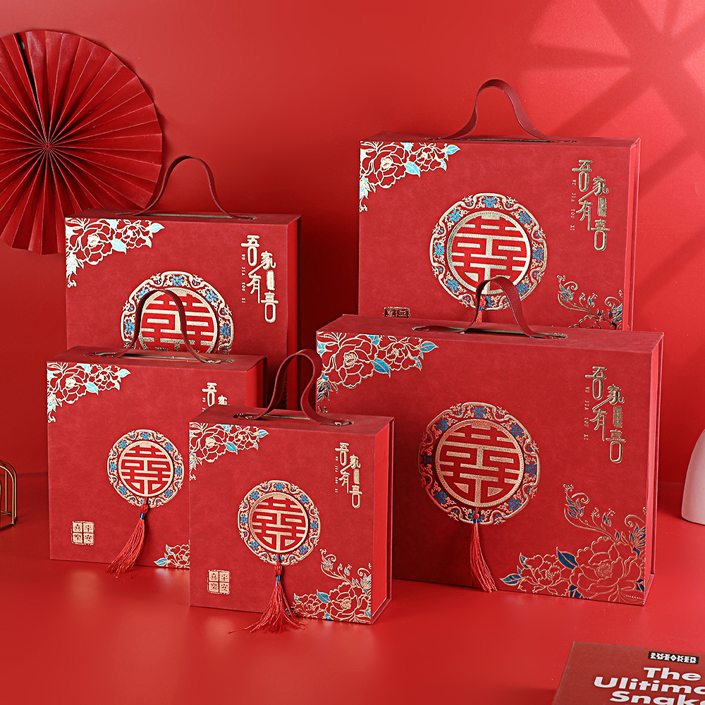 新しい人気の天地蓋喜礼喜糖箱中国式赤いお祝い結婚祝いプレゼント包装箱手提げ袋付き