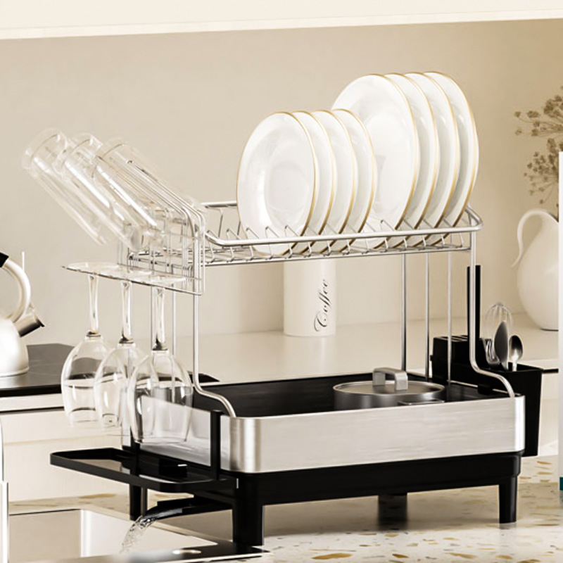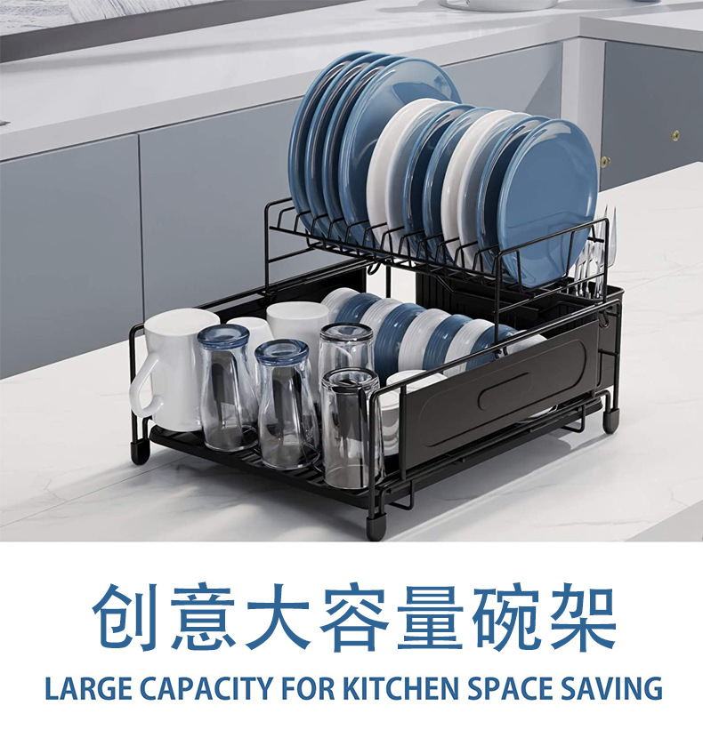 简约风厨房双层置物架 大容量多功能碗碟架 别墅餐具沥水架带托盘