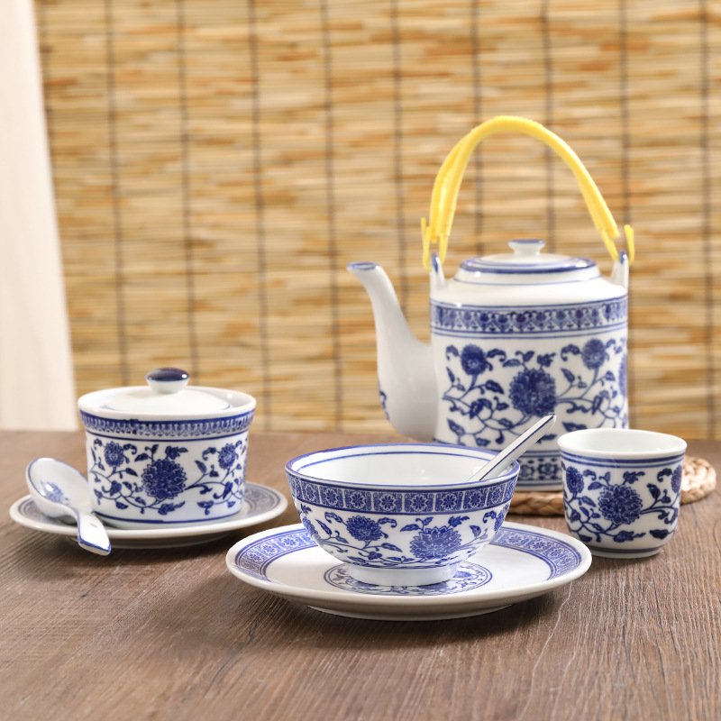 メーカー陶磁器のホテルは台の青花の碗のスプーンの骨の皿のコップの瓶を並べて杯の農家楽の料理屋のテーマのレストランを煮込んで卸売りします。