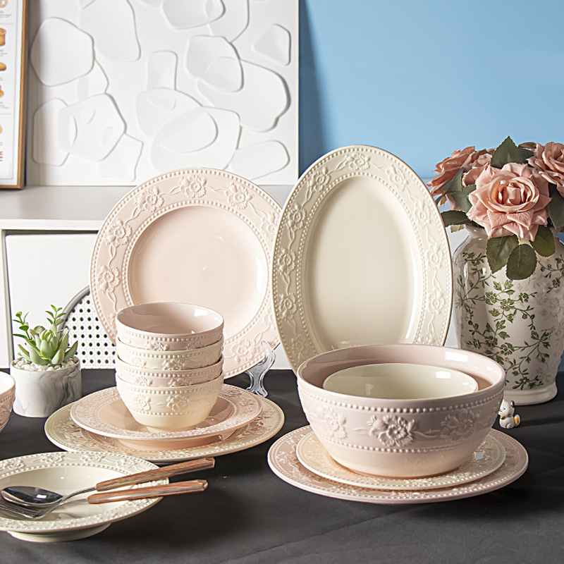 フランスのレリーフボウルとディナーセット、セラミックボウル、スープボウル、ボウルとディナープレート、家庭用プレート、ディナープレート、ボウル、ライトラグジュアリーレース