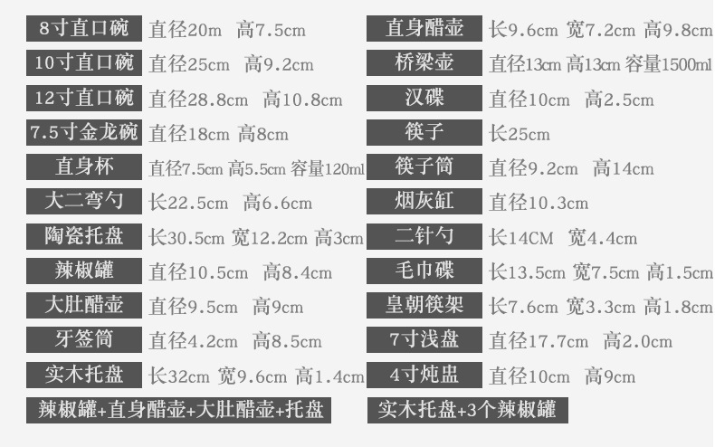 カラー セラミックトレイ,4インチシチュー,7インチ浅皿,ストレート酢壷,実木トレイ + カプサイシン缶3個,漢皿,大腹酢壺,7.5インチのドラゴンボウル,二ピンスプーン,4.5インチストレートボウル,唐辛子缶 + 直身酢壺 + 大腹酢壺 + トレー,8インチのストレートボウル,4インチ灰皿,タオル皿,皇朝箸立て,12インチストレートボウル,実木箸,大きい二曲げスプーン,爪楊枝筒,10インチのストレートボウル,ブリッジポット,チリ缶,ストレートカップ,箸入れ