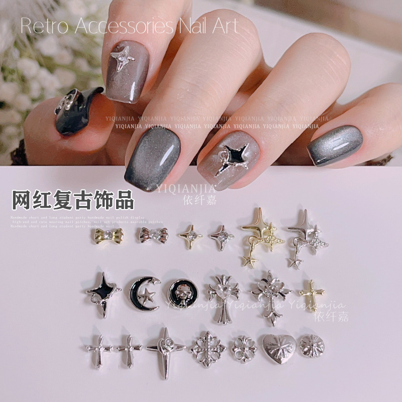 ネイルアートレトロメタルジュエリー平底リボン四芒星ムーンクローハートクロスネイルデコレーション