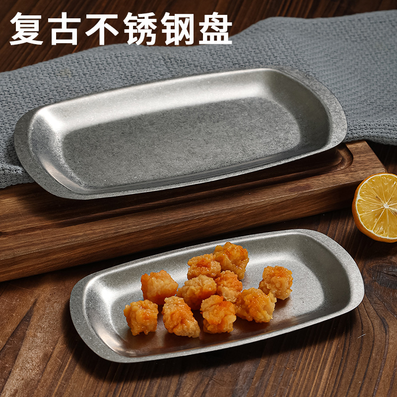 レトロな古いステンレス鋼の長方形プレートフラットプレートスナックプレート浅いプレート商業バーベキュートレイ