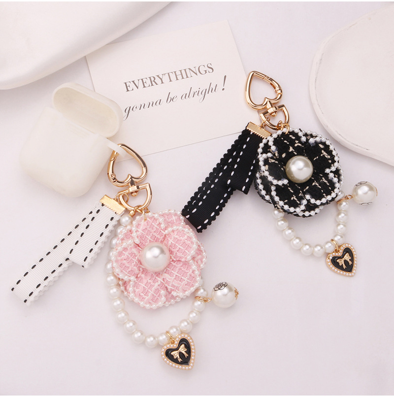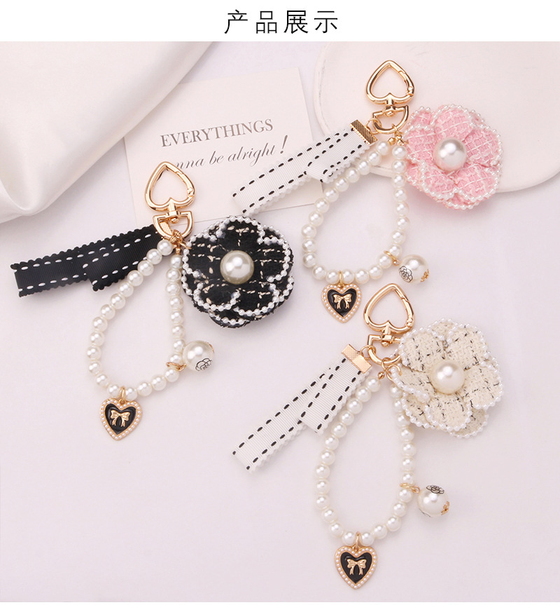 新しい縁取りの大きいサイズの真珠のツバキのキーホルダーのペンダントのアイデアの真珠のチェーンはイヤホンのカバーを飾って装飾を包みます。