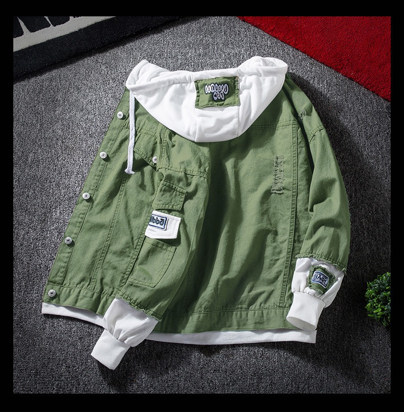 夏のフード付きデニムジャケットメンズ韓国スタイルトレンディカジュアル多用途トップス春と秋のカップル偽ツーピースジャケット