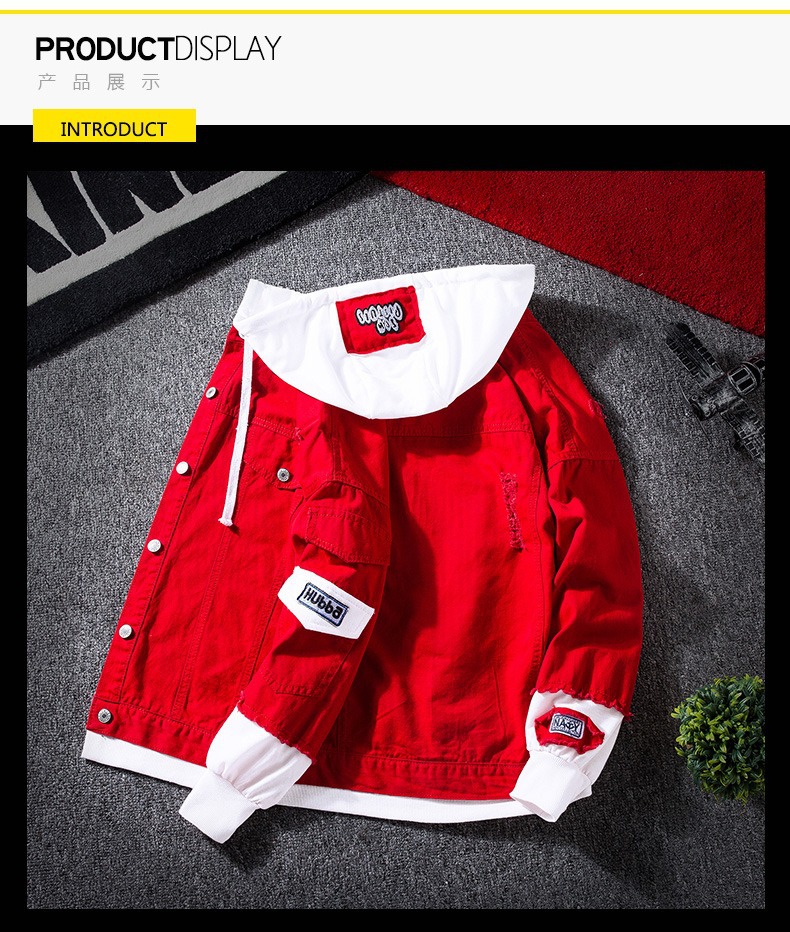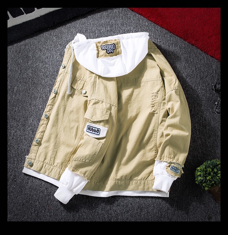 新型男性の穴が開いているカウボーイのコートがかっこいいメンズ韓国版レジャー学生の偽の2つの帽子の野球の服のジャケット