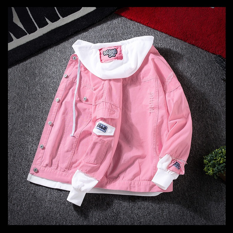 韓国風秋冬フード付きデニムジャケット メンズ トレンド カジュアル 多用途トップス カップル向け フェイクツーピースジャケット