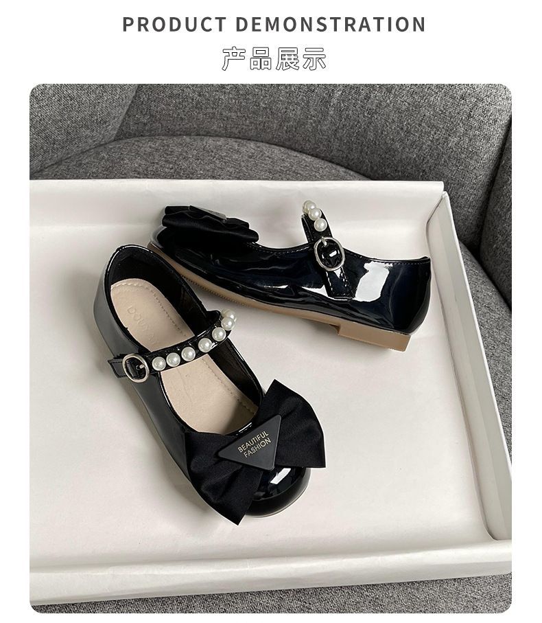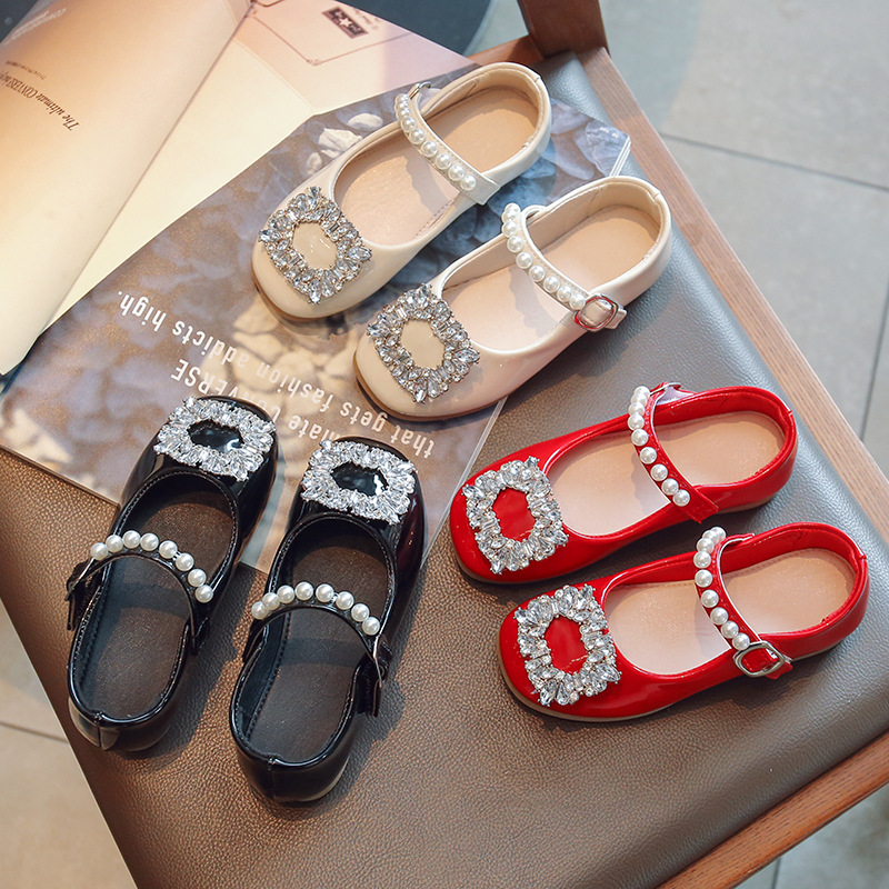 子供用プリンセスシューズ 2025春秋トレンド新作 女の子用ラインストーンパールシューズ ベビーレトロブラックレザーシューズ