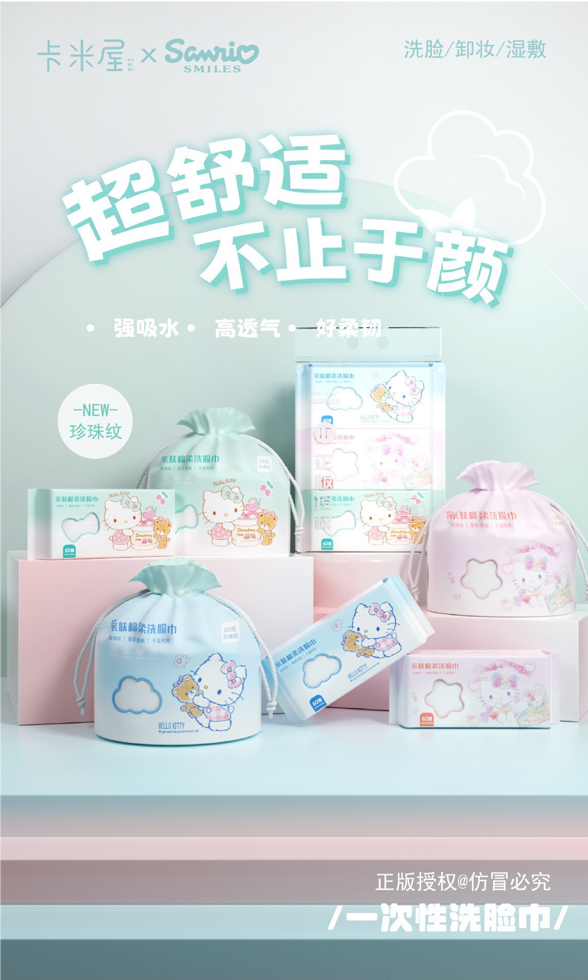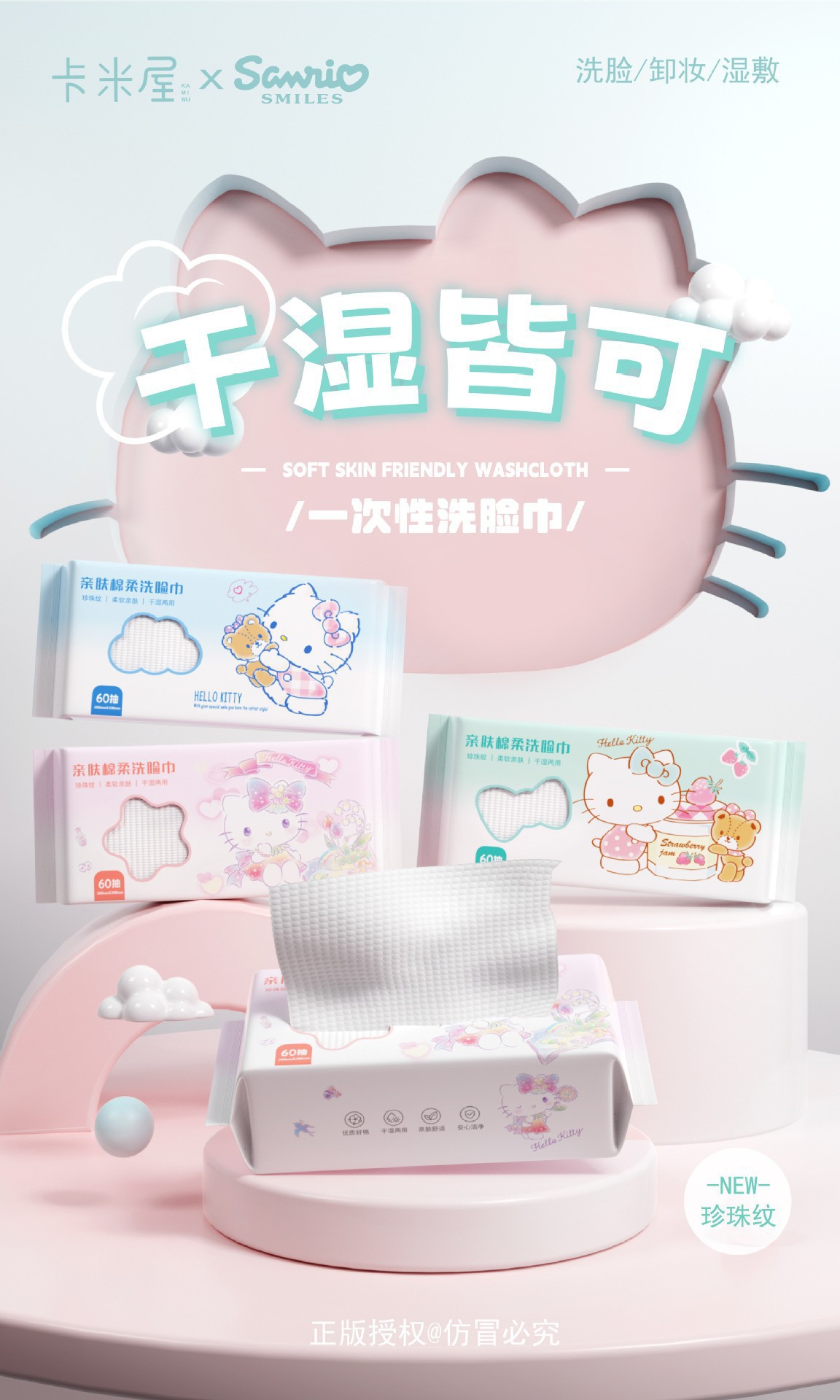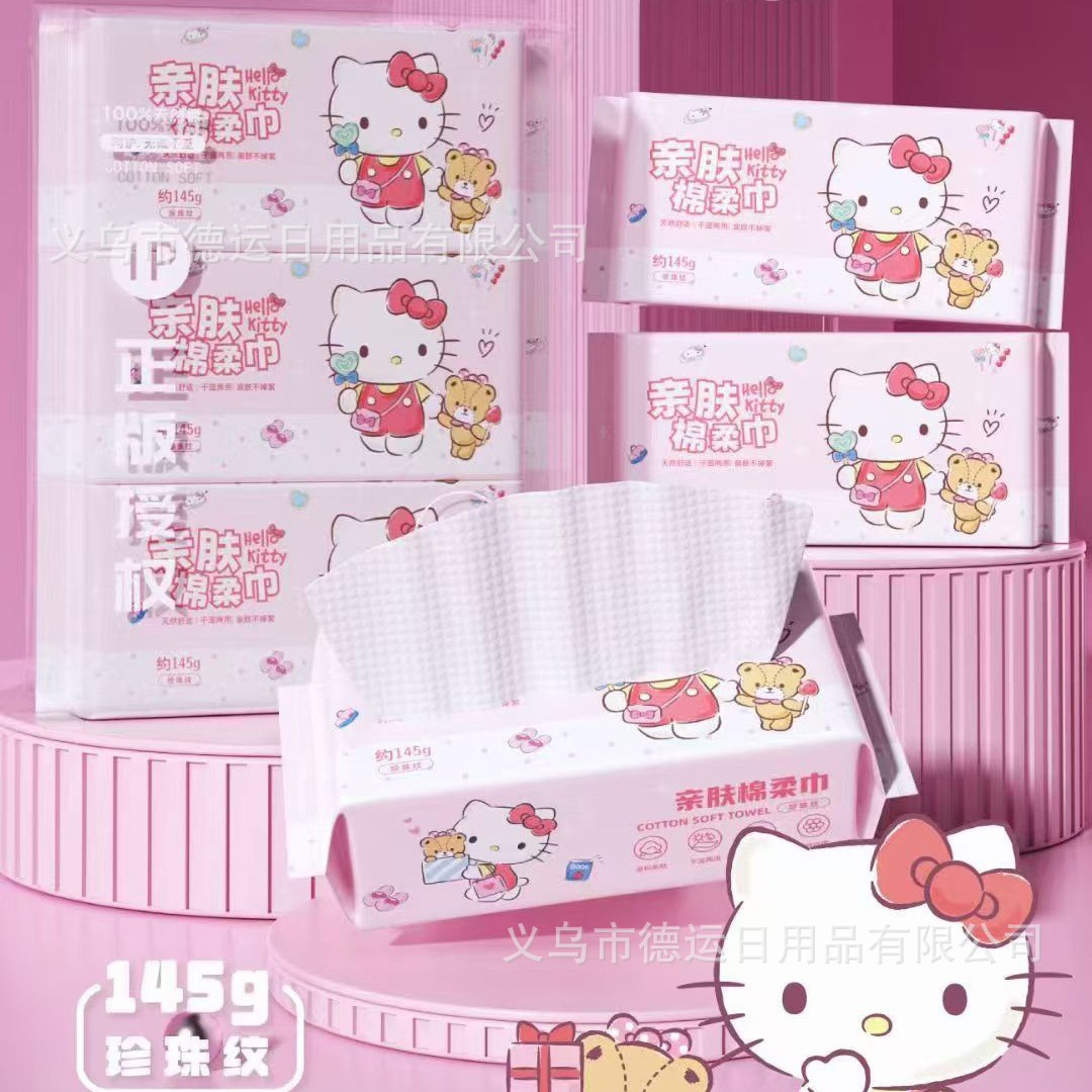 一次性加厚棉柔巾三丽鸥Kitty洗脸巾珍珠纹干湿两用美容抽纸批发