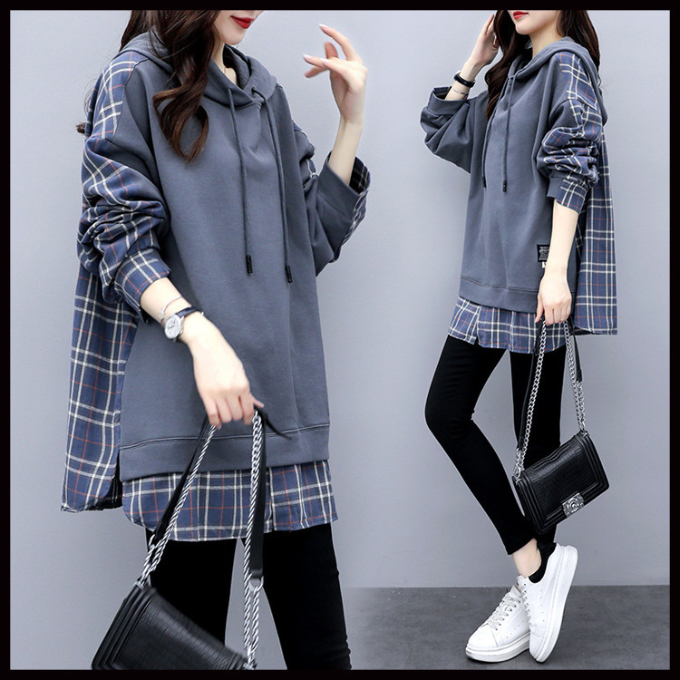 6535綿の偽の2つの衛衣の女性は帽子の秋の女性の韓国版のゆったりしている大きいサイズの婦人服をつないで格子のコートの女性をつなぎます。