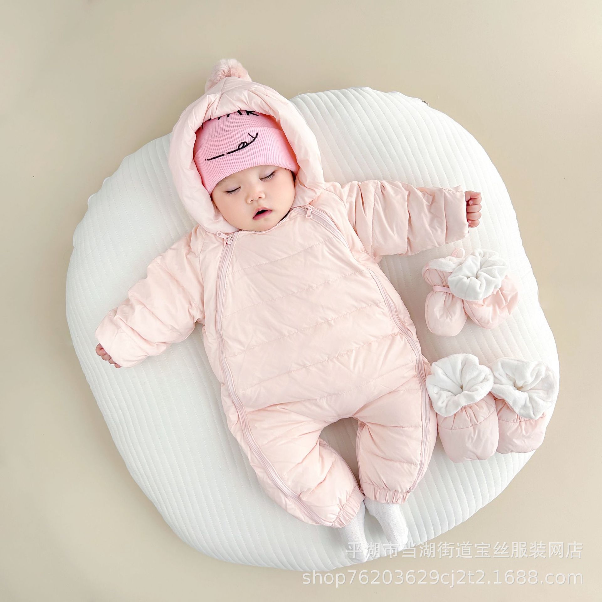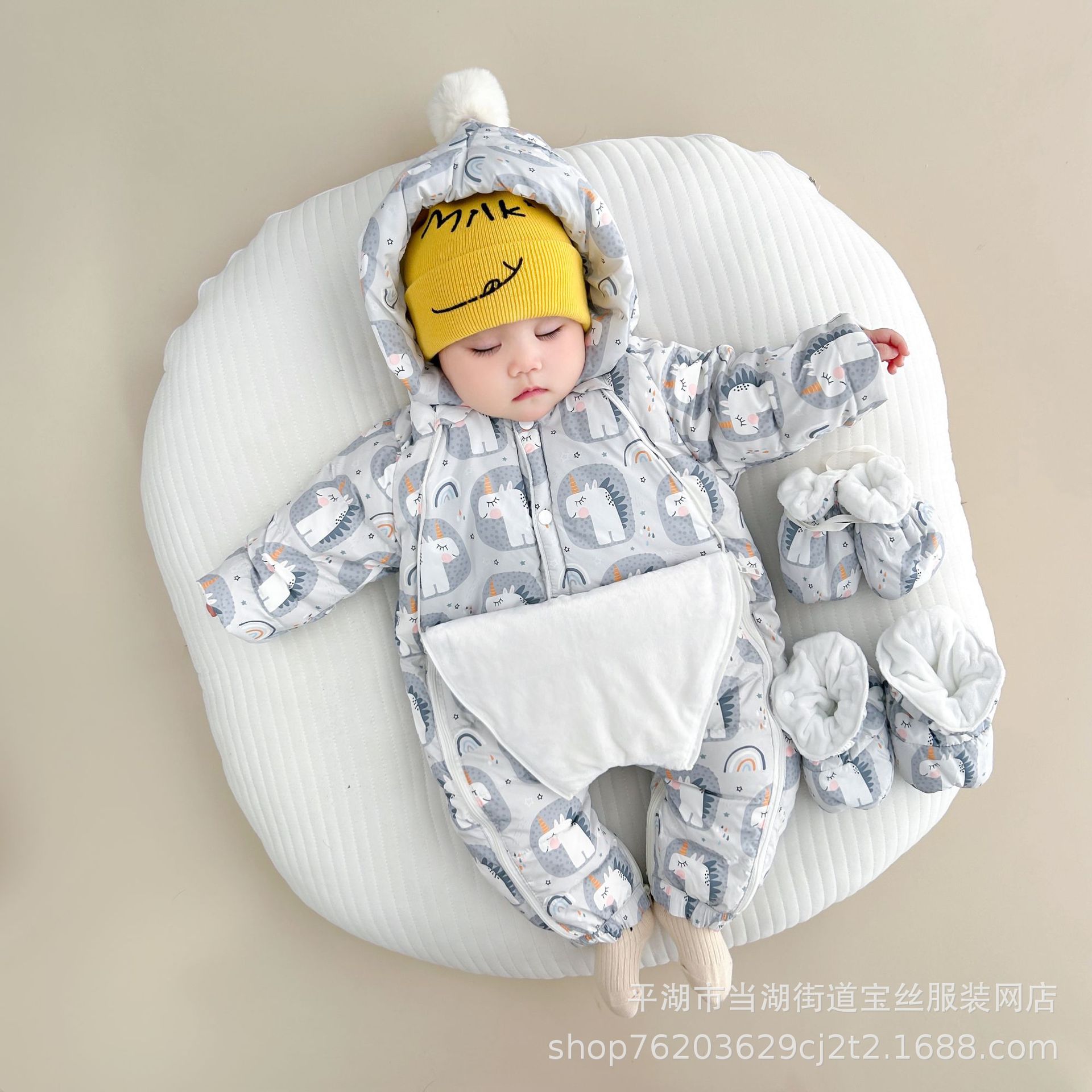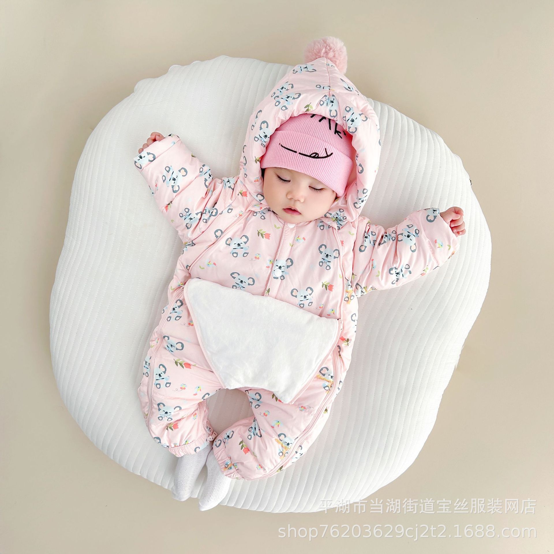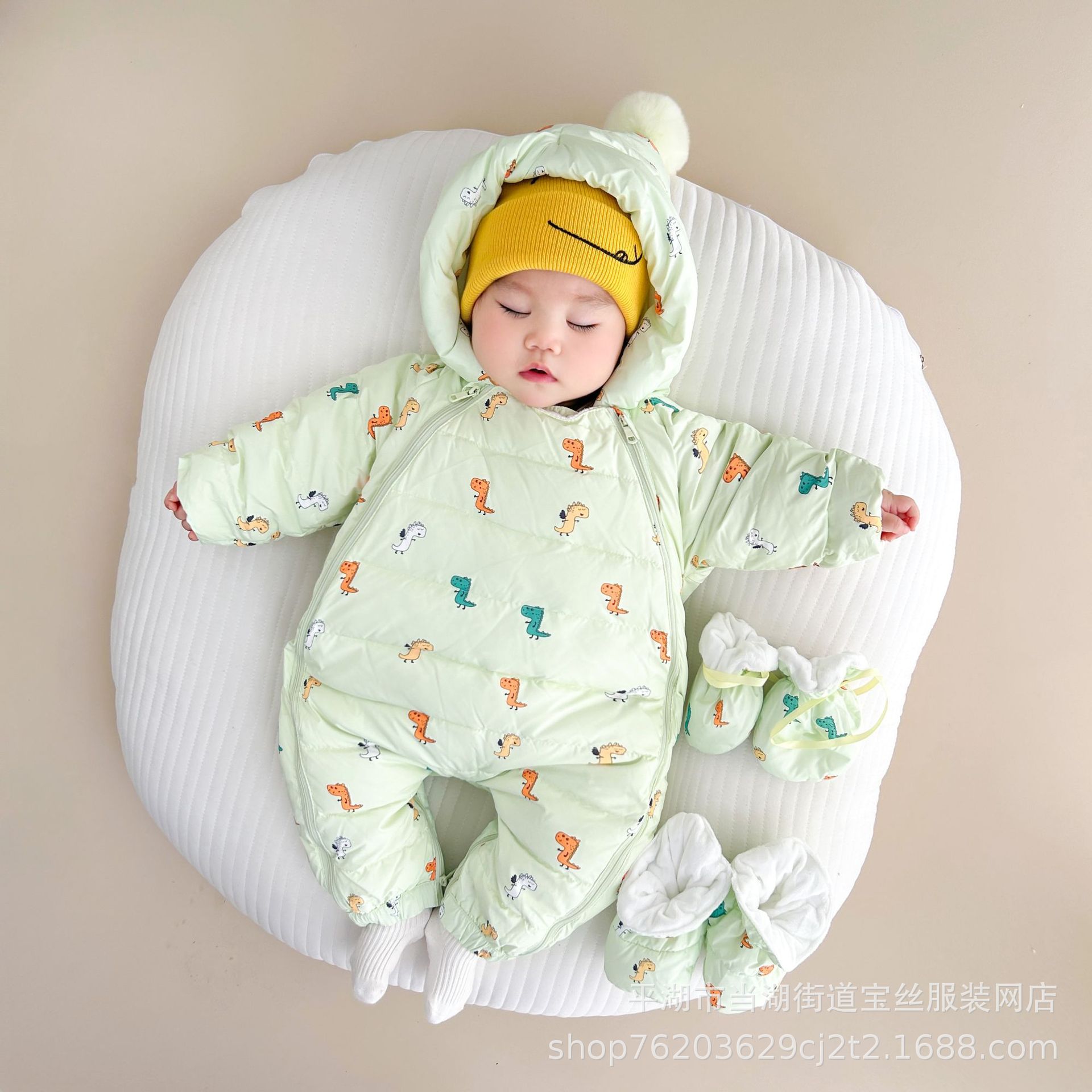 婴儿羽绒服连体衣男女宝宝外出连体哈衣新生儿冬季加厚印花抱衣
