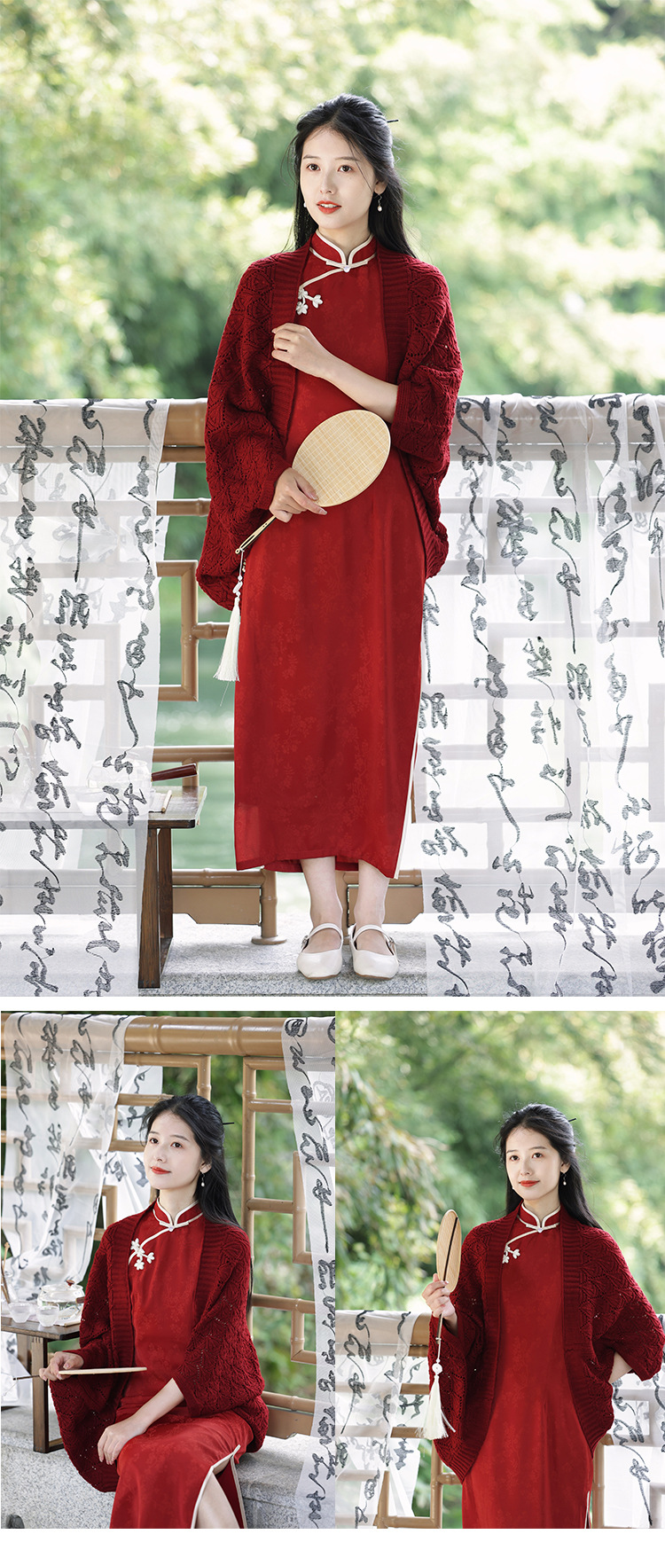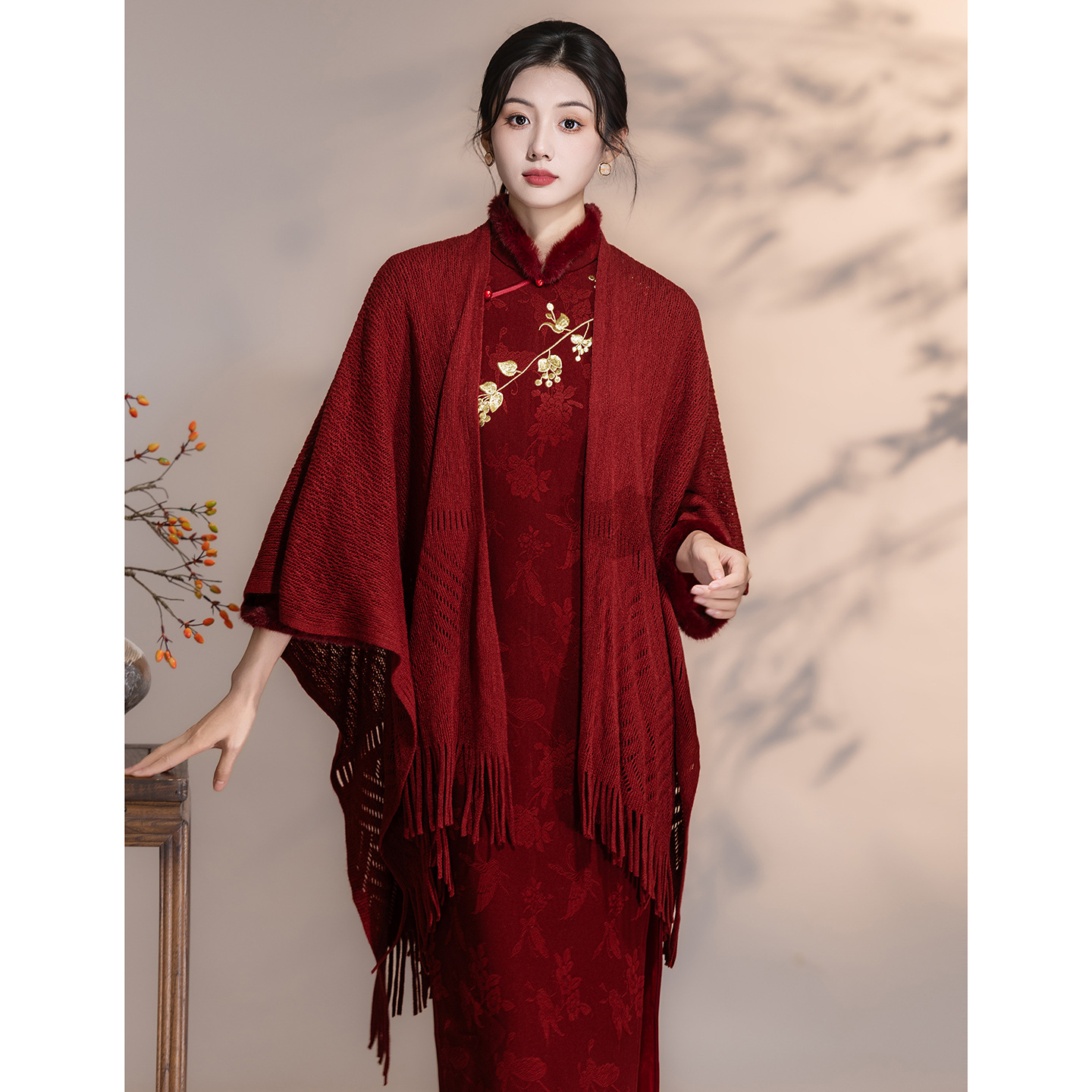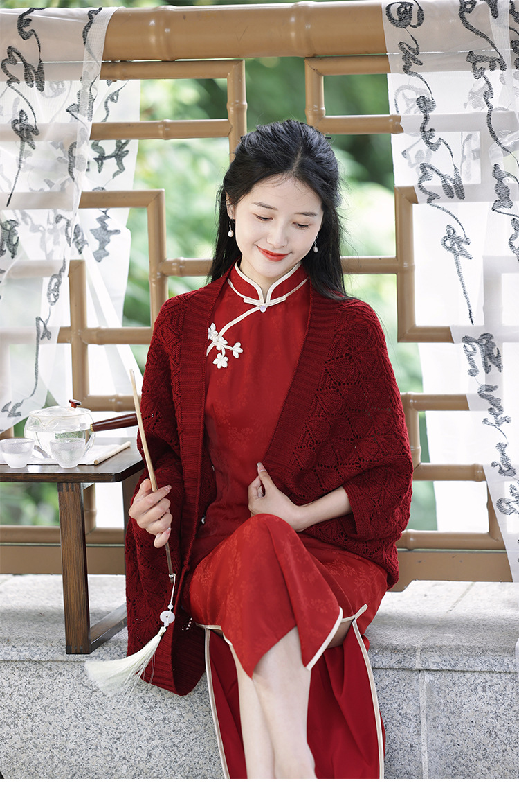 红色旗袍披肩搭配敬酒服新娘旗袍女新中式订婚礼服裙针织流苏外搭