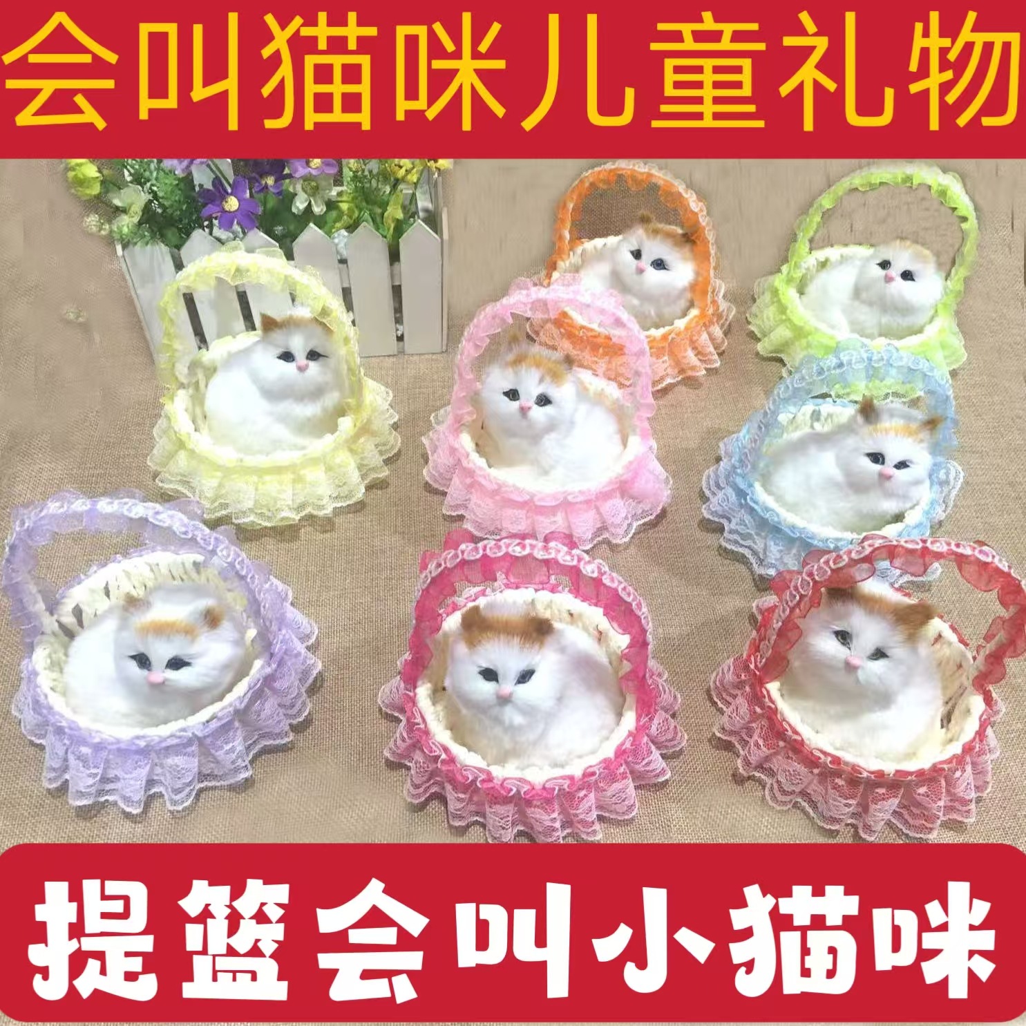 花边提篮仿真猫咪发光会叫小猫景区热卖摆件儿童礼品蕾丝提篮猫