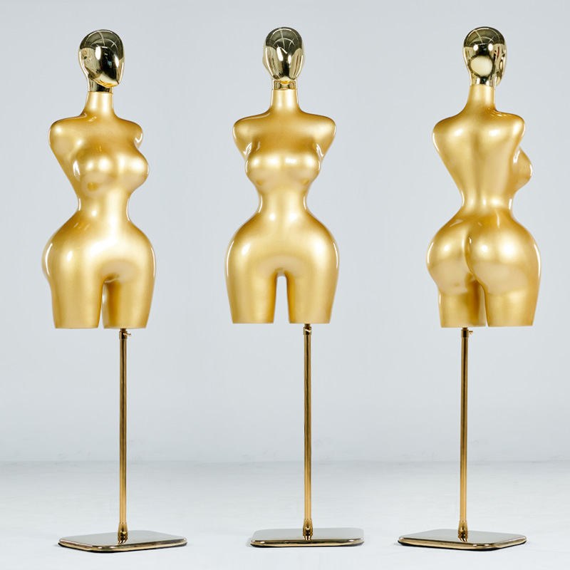 金色の漆を塗る欧米の小さいコードの女性のモデルは頭を持ってカーダシアンのプラスチックの半身の大きい胸の大きい尻の服装の店を持って陳列します。