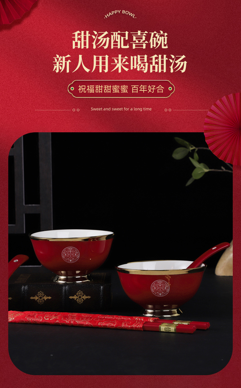 結婚祝いの付き添い用品大全お祝いの甘いスープの碗は結婚祝いの2碗の2スプーンの2箸のワインの赤い彫刻の陶磁器の碗の6セットを結びます。
