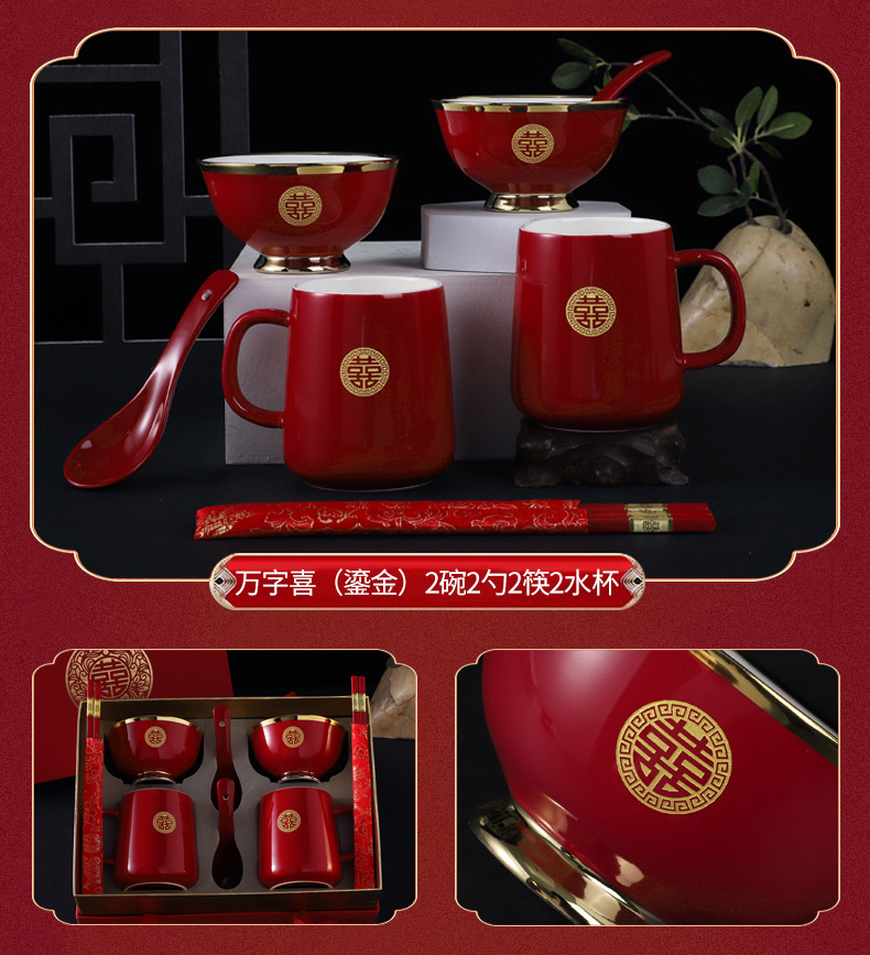 2025雅梓新婚中式陪嫁敬茶具套装红色喜碗喜筷碗筷礼盒婚礼用品