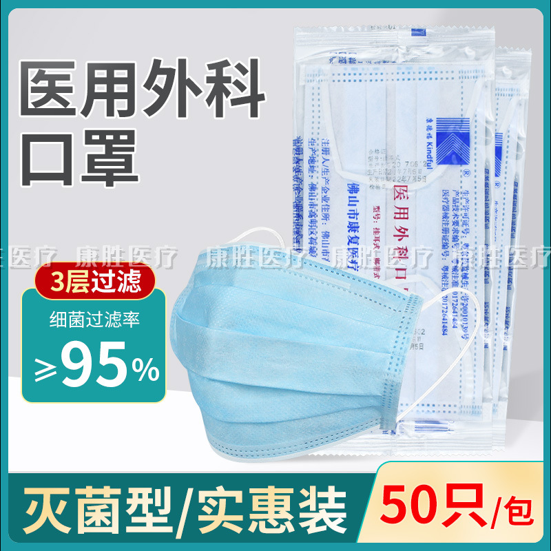 康徳福医療用外科マスク独立包装使い捨てマスク三層不織布成人50個一包