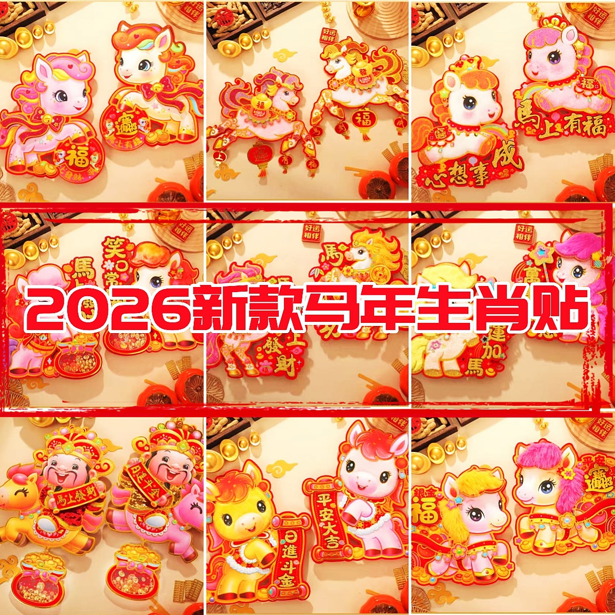 2026马年立体生肖对贴门贴烫金春节卡通福字装饰新年門貼对联批发