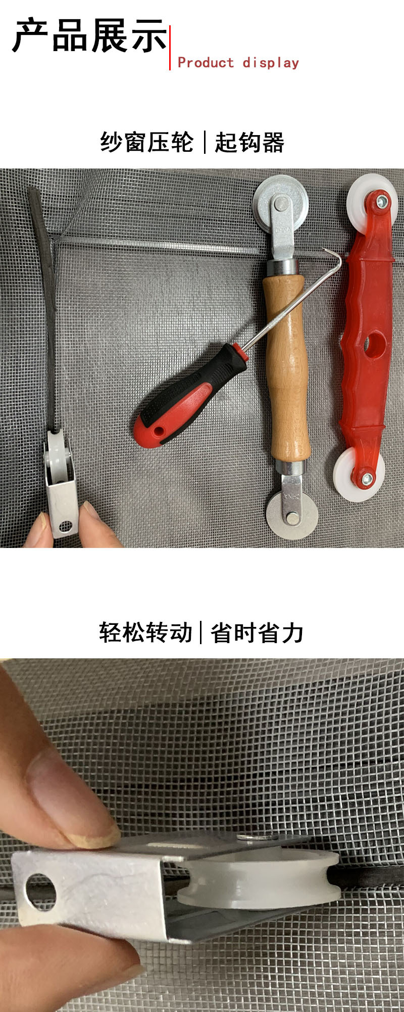 卸売アルミ合金ドアと窓の網の糸のホイールの取り付けツールのフックの木の柄の金属の凹凸のダブルヘッドの網戸のホイール