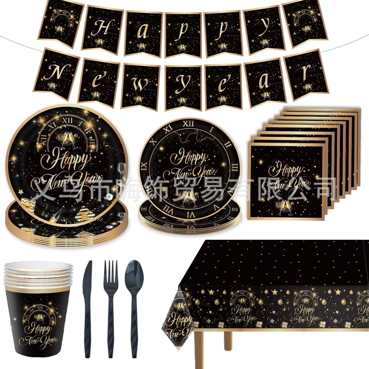 クロスボーダー2026年新年テーマ使い捨てブラックゴールド紙皿、ペーパータオル、紙コップ、テーブルクロス、旗装飾新年パーティーセット