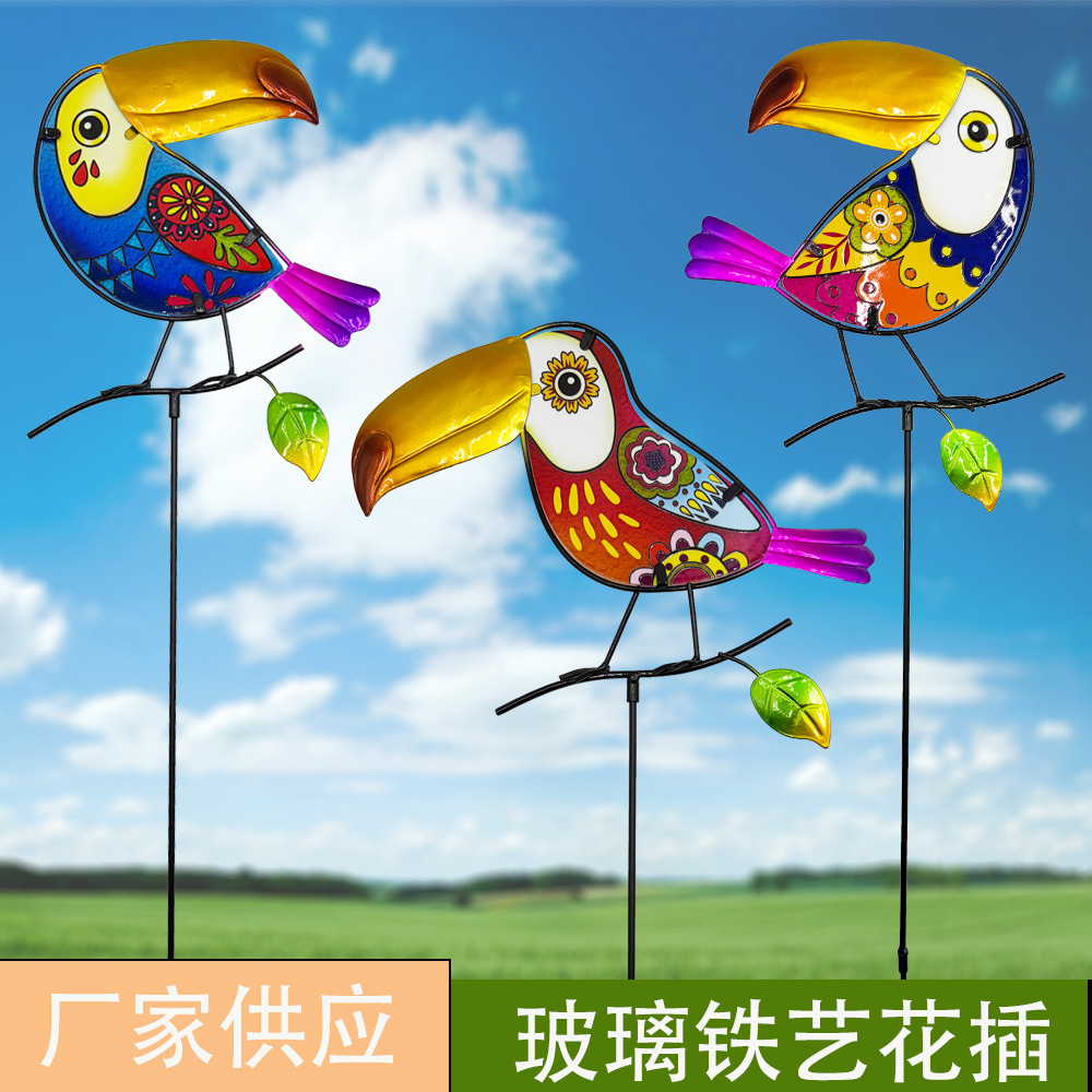 巨嘴鸟铁艺花插大嘴鸟玻璃彩绘地插庭院园艺户外工艺品装饰跨境