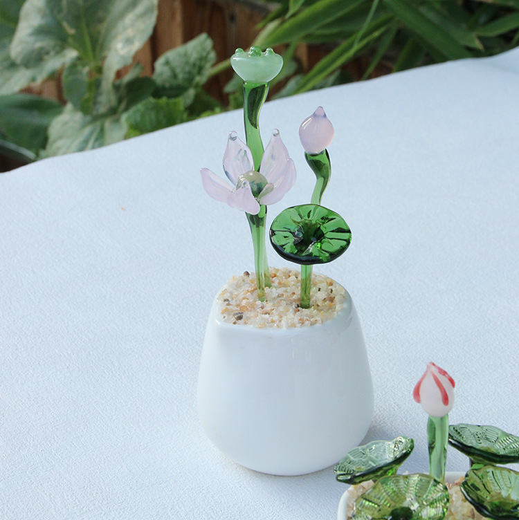 シ博の特産の創意瑠璃はハスの花の鉢植えのガラスの工芸品の事務室をシミュレーションして国風の緑を植えて贈り物を植えます。