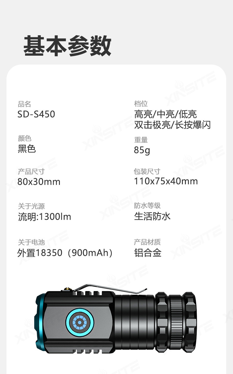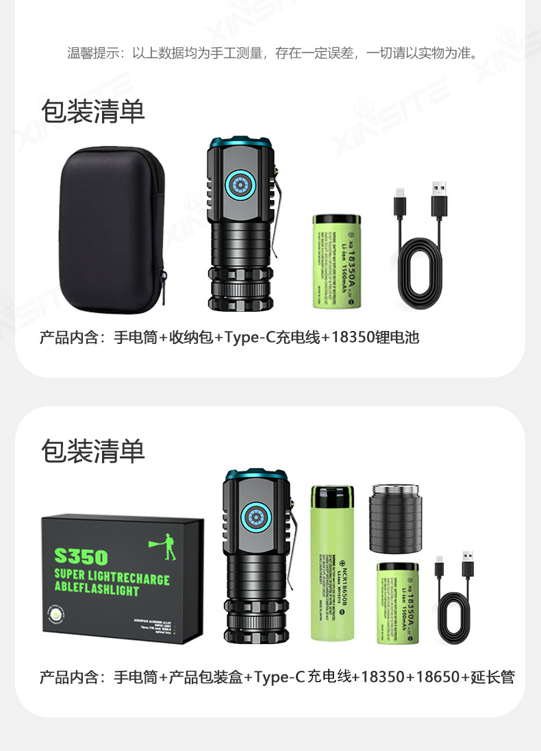 S350(裸ランプ配線白箱),S400(裸ランプ配線白箱),S450 赤色ライト付き(裸ランプ配線白箱),S350 (18350A + データケーブル収納バッグ),S400 (18650A+データケーブル+ギフトボックス),S450 赤色ライト付き (18350A+ データケーブル収納バッグ),S350X (18350A+延長チューブ+18650A) バッテリー寿命構成,赤色光 (18350A+延長チューブ+18650A) バッテリー寿命構成の S450X
