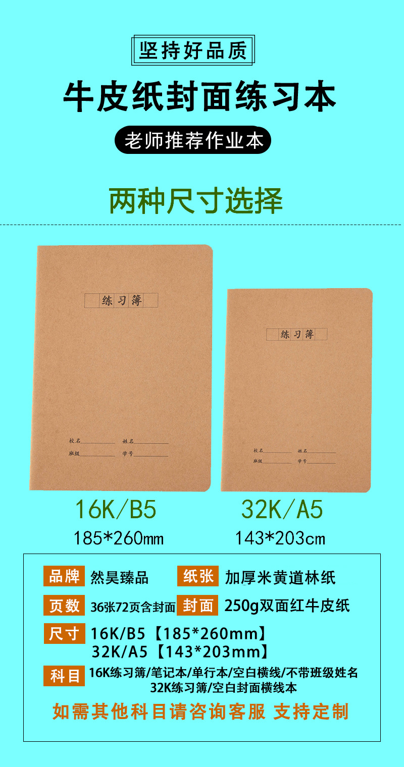 クラフト紙16kノート卸売り小学生の中高生練習本国語数学英語小字本