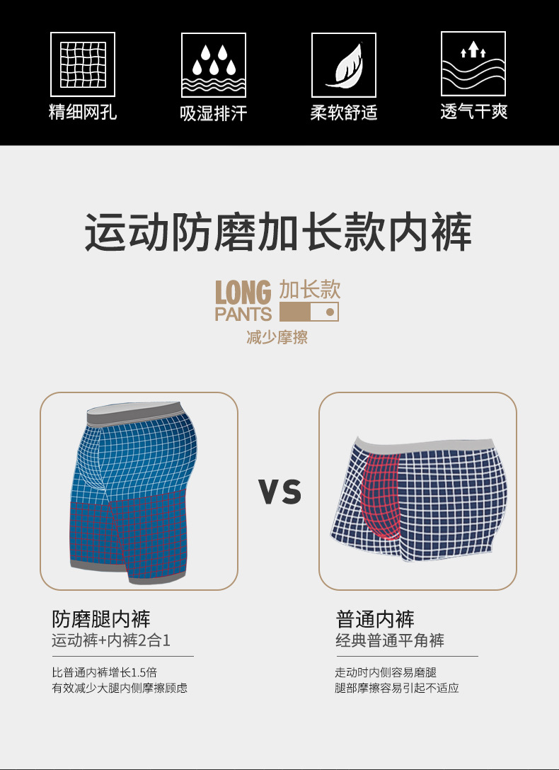 严选运动内裤防磨男士四角裤 不磨裆透气纯棉高弹平角裤
