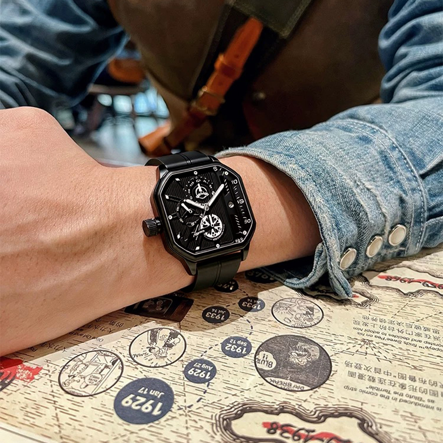 スクエアブラックウォリアーメンズウォッチ防水夜光カレンダークォーツ時計ライブクロスボーダー外国貿易ホットスタイルドロップシッピング
