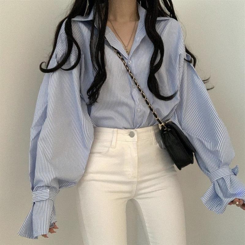 多用途のランタンスリーブデザイン2025春秋ルーズシャツトップ女性ニッチ韓国風カレッジスタイルストライプ新スタイル