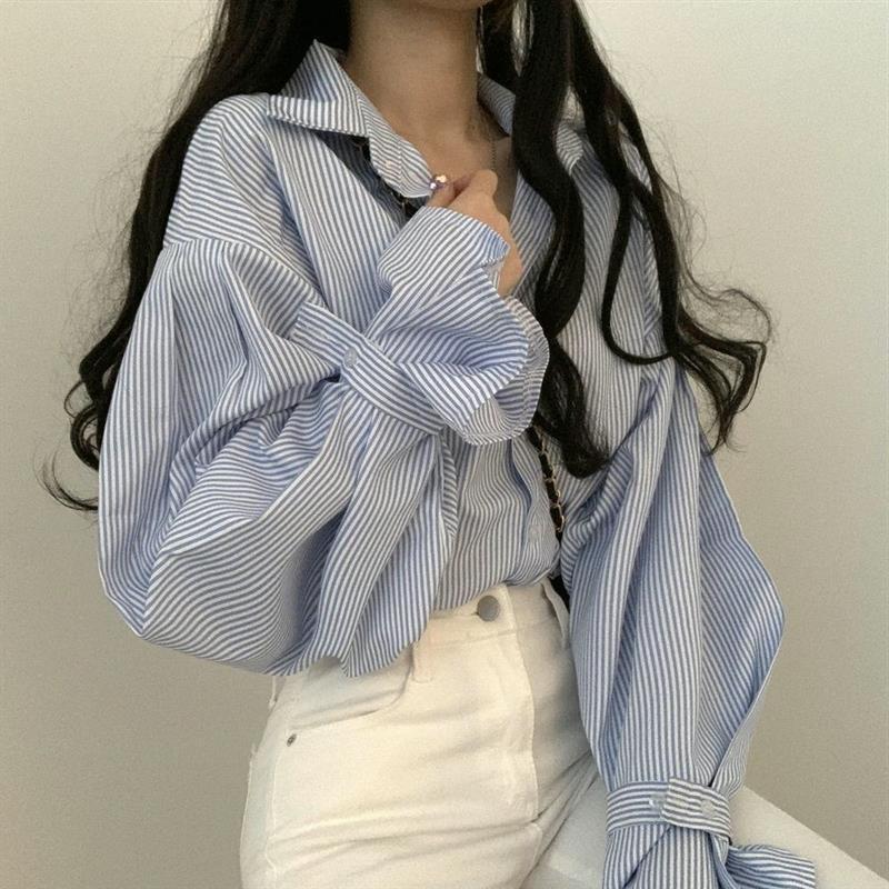 2025 春と秋の新韓国スタイルカレッジスタイルデザインルーズで多用途なニッチランタンスリーブストライプシャツトップ女性用