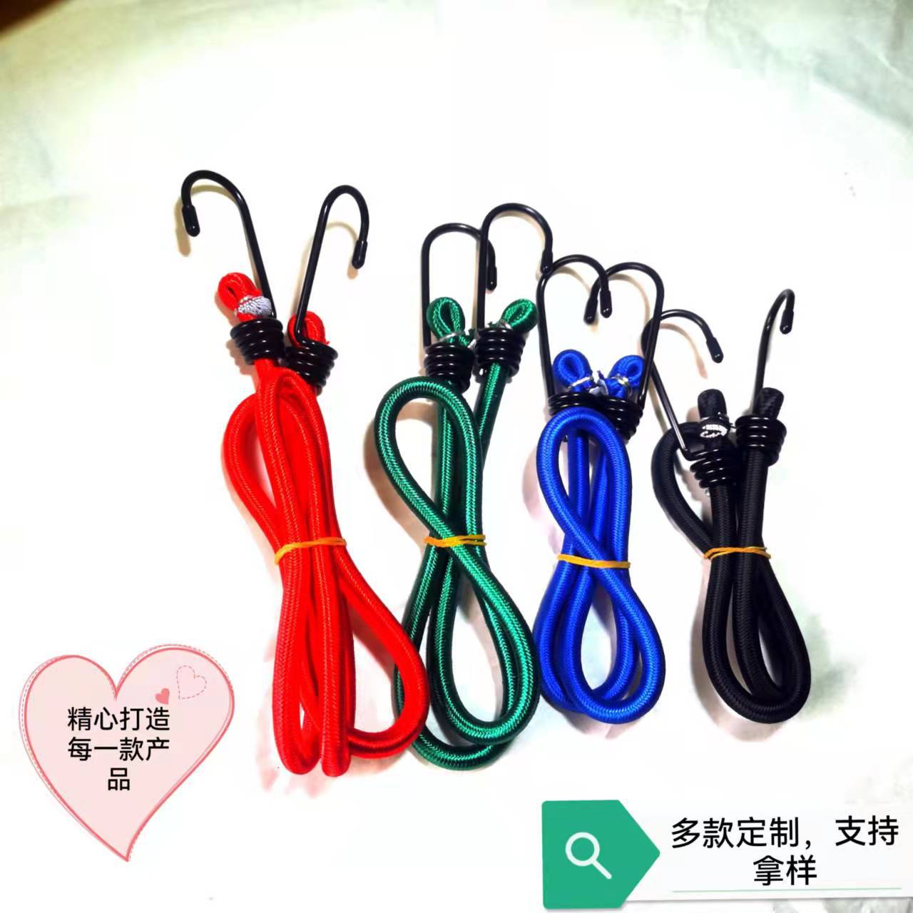 该产品行李绳带2个黑色钢钩,长度以规格框里显示的为准。绳子长度也可以按需定制,规格框里显示的规格各代表的意义如下:比如6mm*20cm的6mm是代表绳子的粗度,20cm是代表了这款行李绳的总长度,其中一个钩子有效长度是5CM,那绳子的有效长度就是10CM,所以还请亲人们考虑好自己所需要的产品规格尺寸是多少, 该产品的材质是采用泰国乳胶丝用pe单丝包裹精编而成再配上弹簧钢钩,从而使该产品有弹性好,重量轻,耐磨,承受力强等优点,而且防水性也好,特别是耐磨x 该产品的用途广泛,可以用在快递车,摩托车,自行车,购物车,其他货物捆绑物上面 我们是生产厂家,只要您有需求,我们可以为您制作不同款式形状的捆绑绳