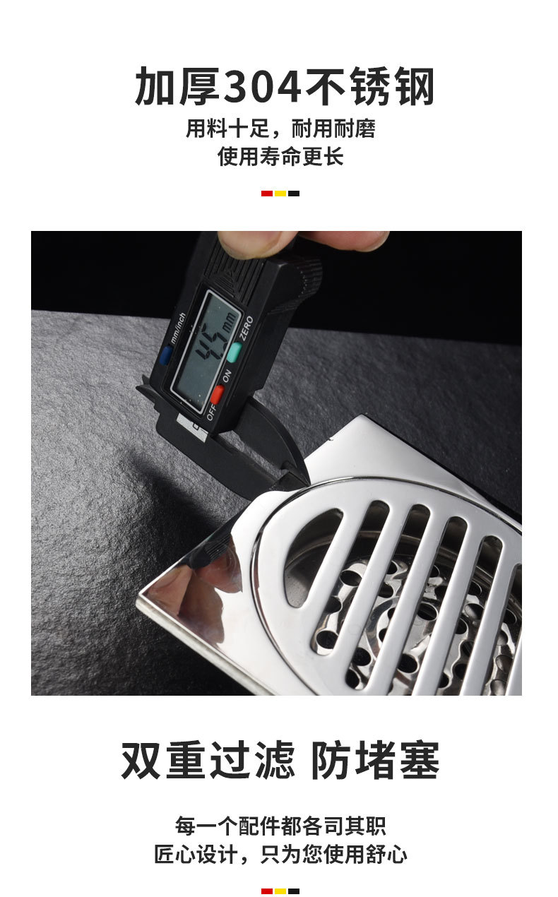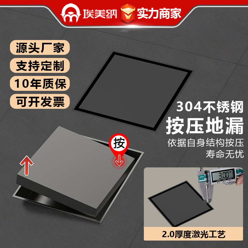 304不锈钢地漏浴室地漏防臭加厚卫生间用按压隐形可镶砖足2.0厚度