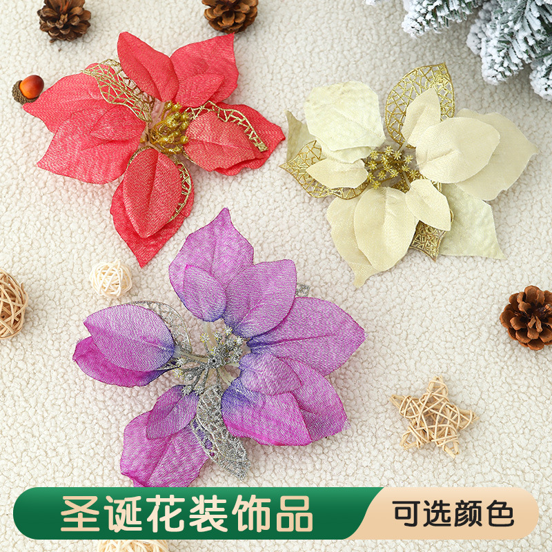 クリスマスの金色のクリスマスの花はクリスマスツリーを飾って赤い紫色の花のシーンを飾って装飾品を並べます。